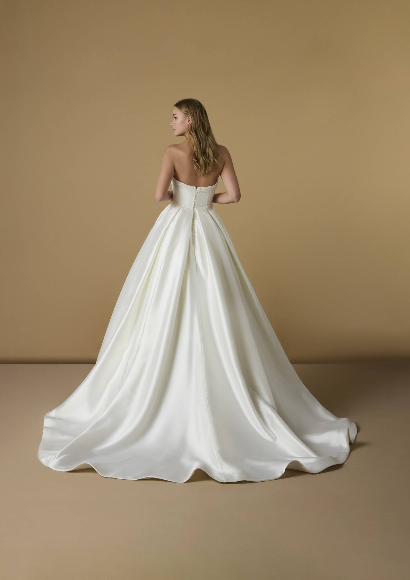 Come una scultura che prende vita, questo abito da sposa principesco ha un corpetto arricchito da tre spalline con discreti intarsi di perline lungo la scollatura a cuore. Realizzata in mikado, la gonna cade maestosa in uno strascico a cattedrale.