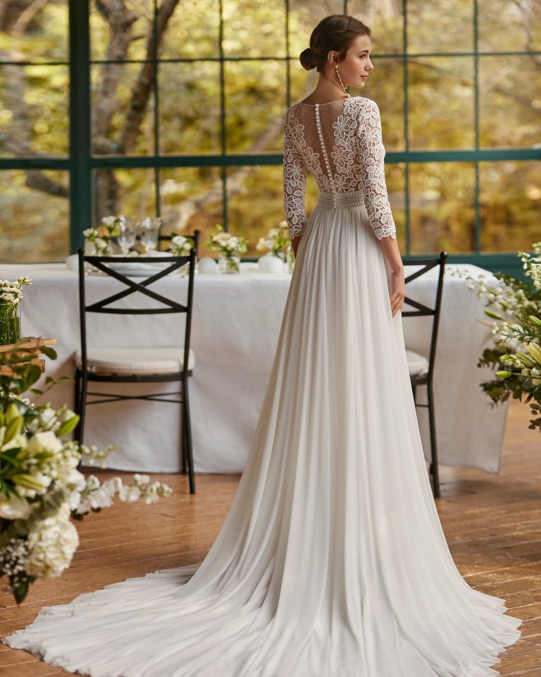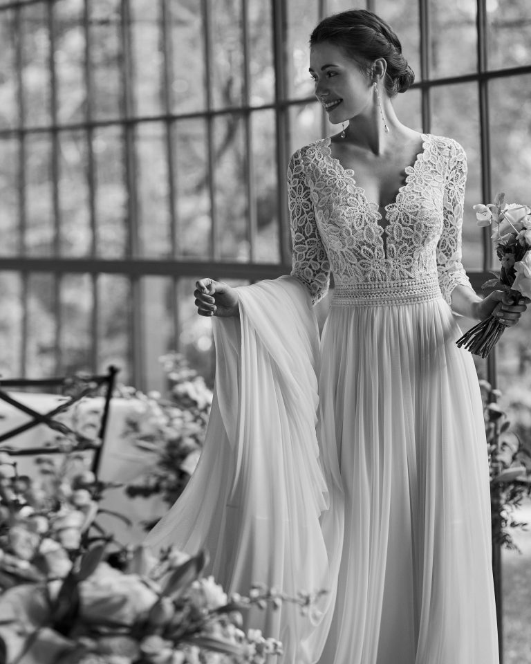 Nica un vero abito da sposa boho-chic, con scollo profondo, schiena chiusa con abbottonatura e maniche francesi.