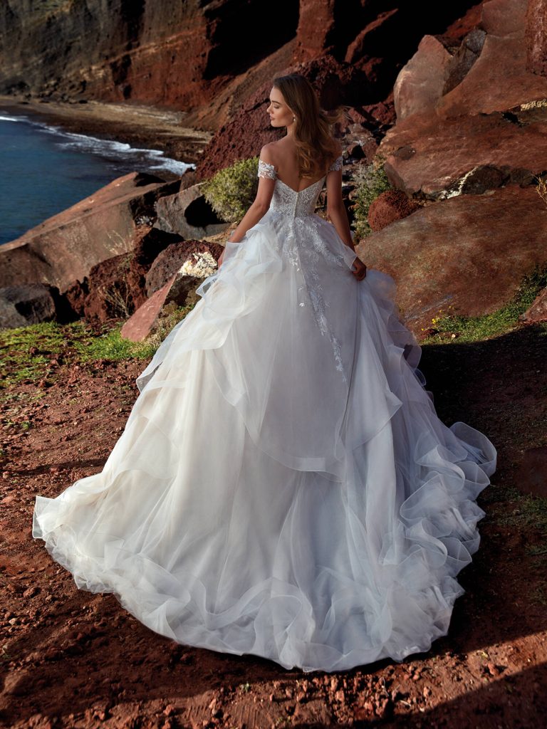 Abito da sposa principesco con corpetto in pizzo e ampia gonna in tulle a balze. Un sogno romantico dal fascino teatrale, perfetto per chi desidera sentirsi una vera regina nel suo giorno speciale