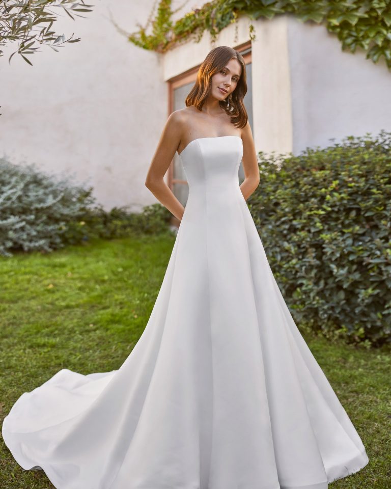 Abito da sposa dalla linea ad A, realizzato in raso con scollo a cuore e giacchino removibile confezionato in pregiato guipure.