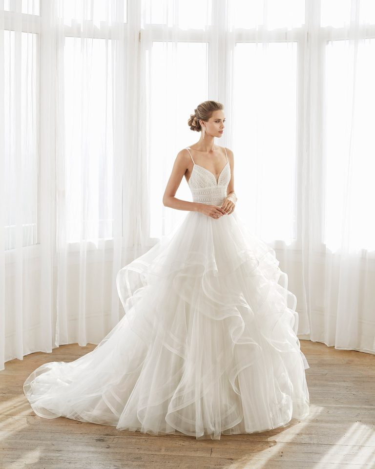 Iconico abito da sposa principessa firmato Rosa Clará, con corpino a cuore e spalline sottili, che valorizzano con eleganza la silhouette. La gonna ampia in tulle avorio si apre in morbide balze vaporose, creando un effetto scenografico e romantico. Perfetto per una sposa che sogna un look fiabesco ma moderno.