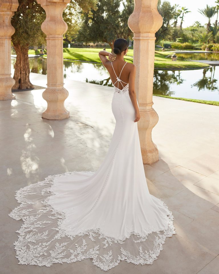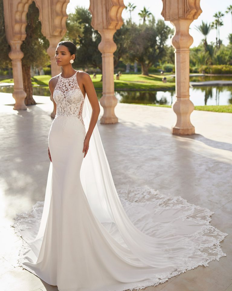 Abito da sposa a sirena realizzato in crepe bielastico con corpetto in pizzo e perline, scollo halter, spalline incrociate sulla schiena, strascico in pizzo e meravigliosa mantella alla moda.