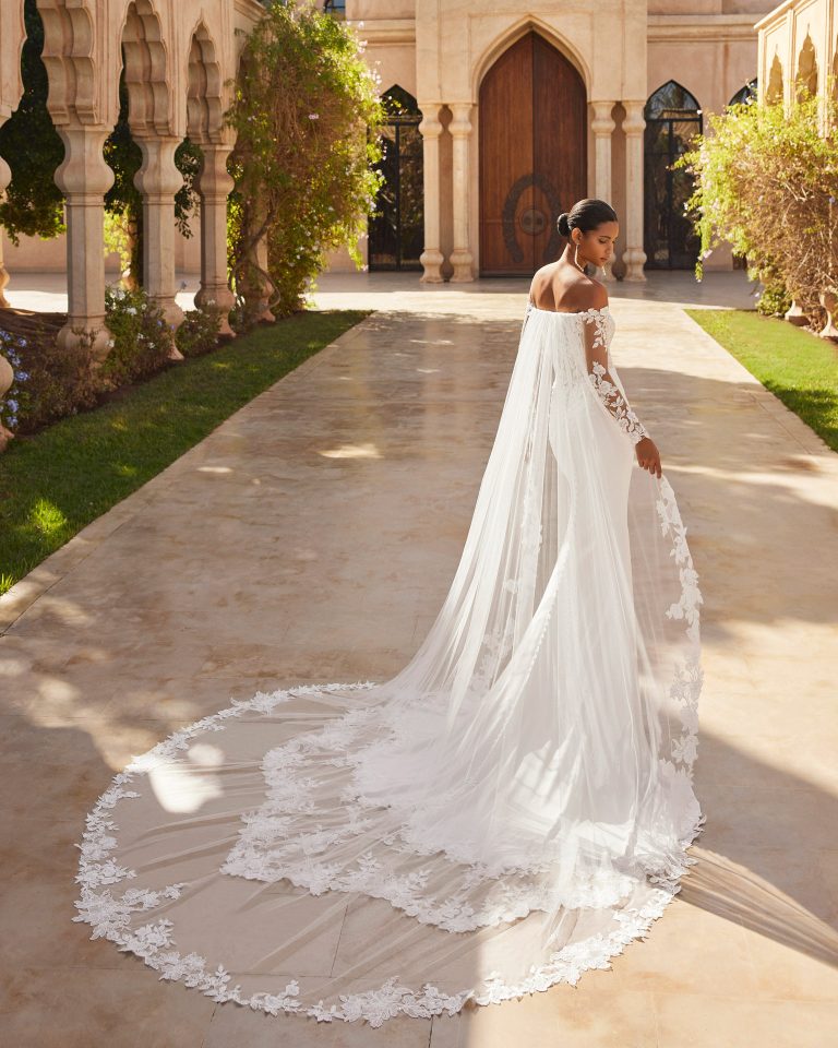 Abito da sposa a sirena realizzato in crepe con corpetto in pizzo e perline, scollo omerale a manica lunga, strascico in pizzo e ulteriore strascico removibile.