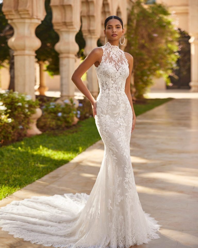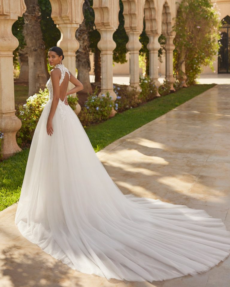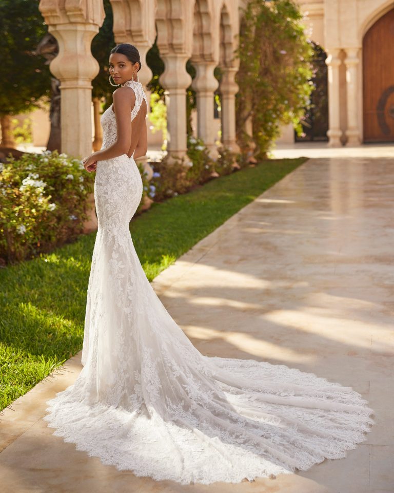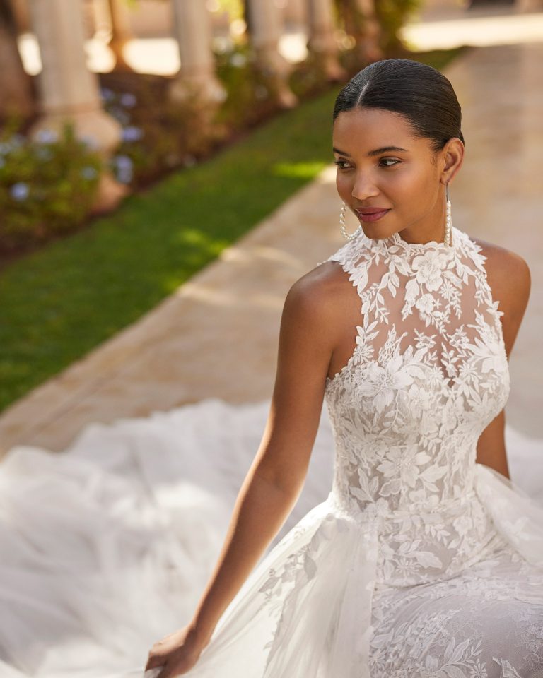 Abito da sposa a sirena con sopragonna, realizzato in pizzo ricamato e tulle. Meraviglioso collo halter e schiena scoperta.