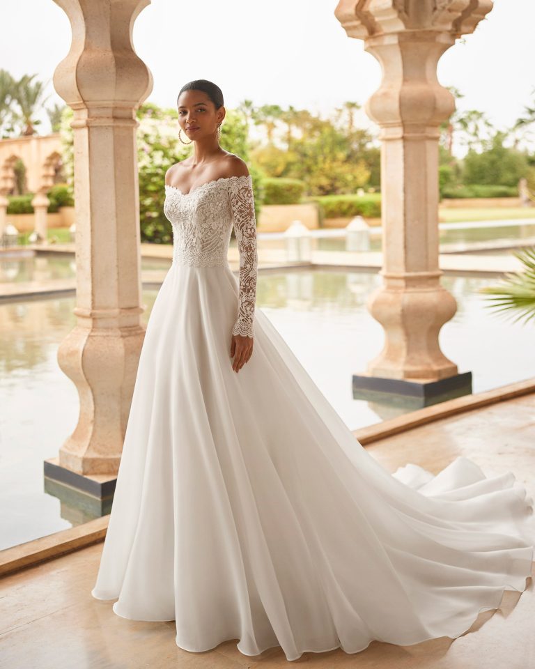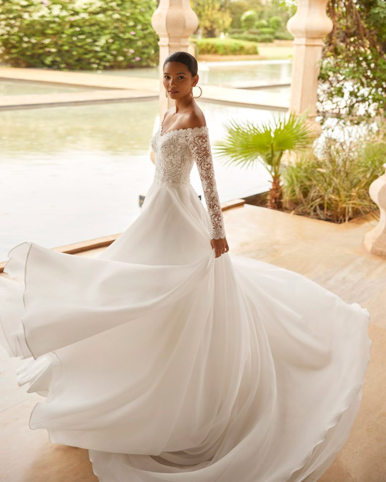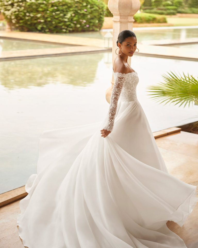 L’abito da sposa Omic di Rosa Clará incanta con il suo corpetto in pizzo ricamato e maniche lunghe trasparenti che abbracciano le spalle con un delicato scollo a barchetta. La gonna ampia in organza cade con leggerezza, regalando un effetto etereo e romantico.