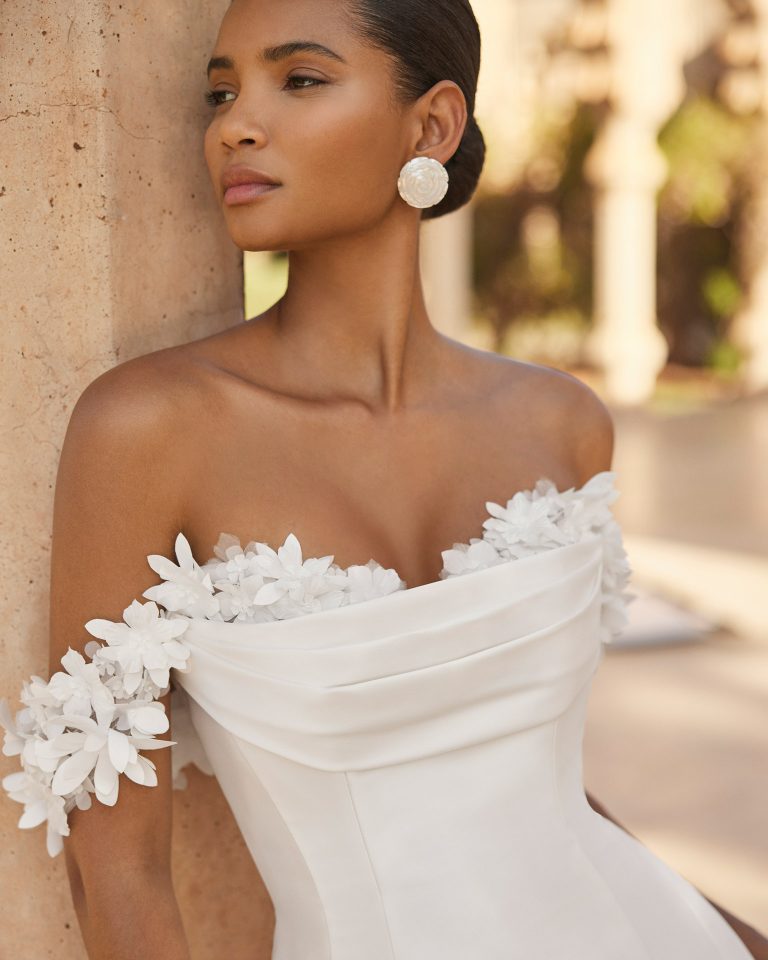 Abito da sposa A-line realizzato in mikado con scollo omerale, spalline cadenti e prezioso strascico removibile