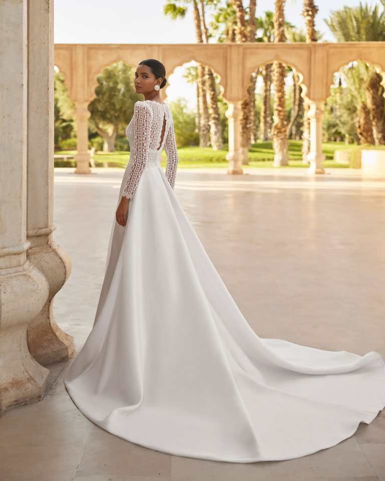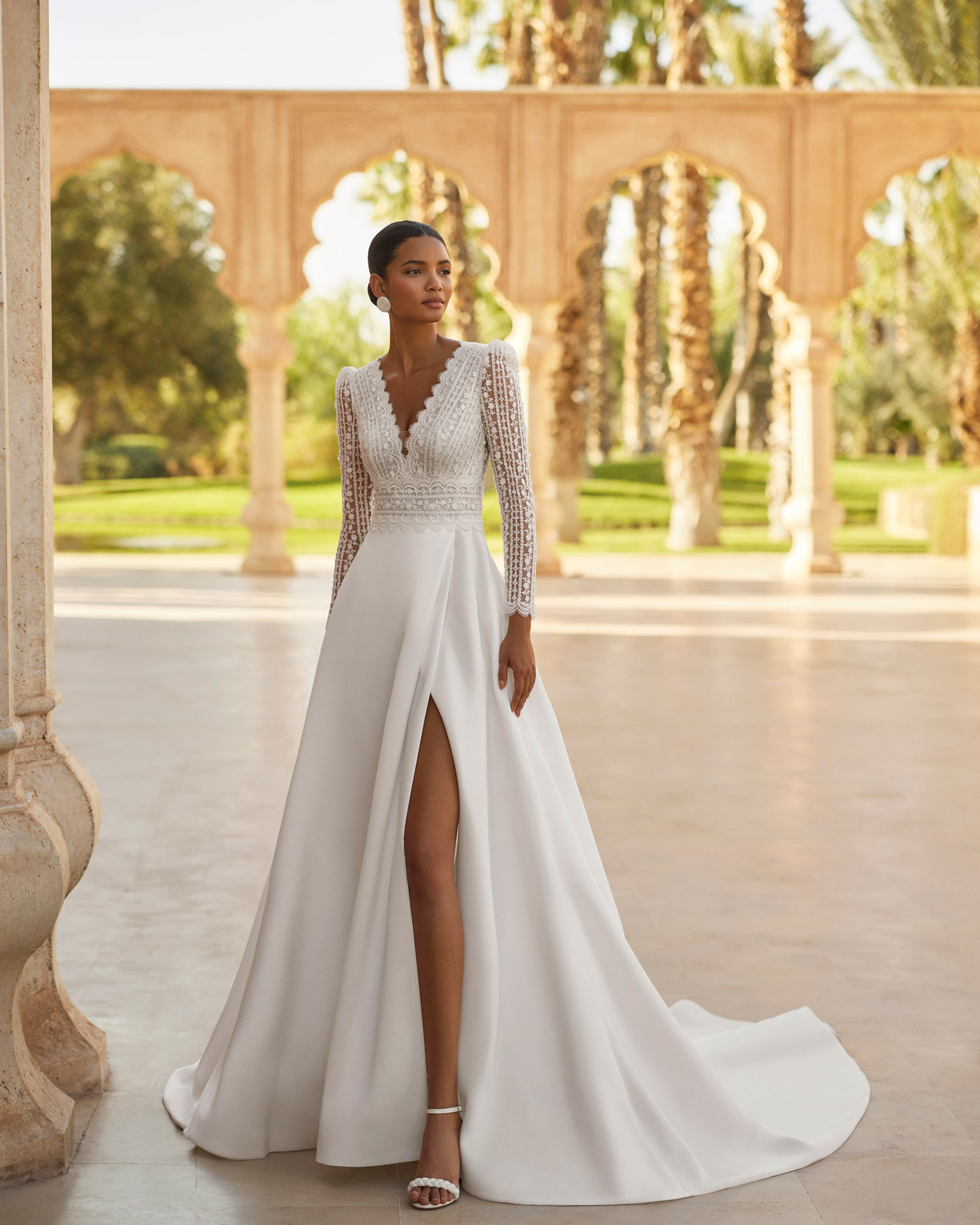 L’abito da sposa Orense di Rosa Clará unisce un corpetto in pizzo ricamato con scollo a V e maniche lunghe trasparenti a una gonna con spacco frontale per un tocco di sensualità elegante. Disponibile presso il nostro atelier nella versione esclusiva con gonna in tulle, che dona leggerezza e romanticismo, diversa dal mikado mostrato nella foto.