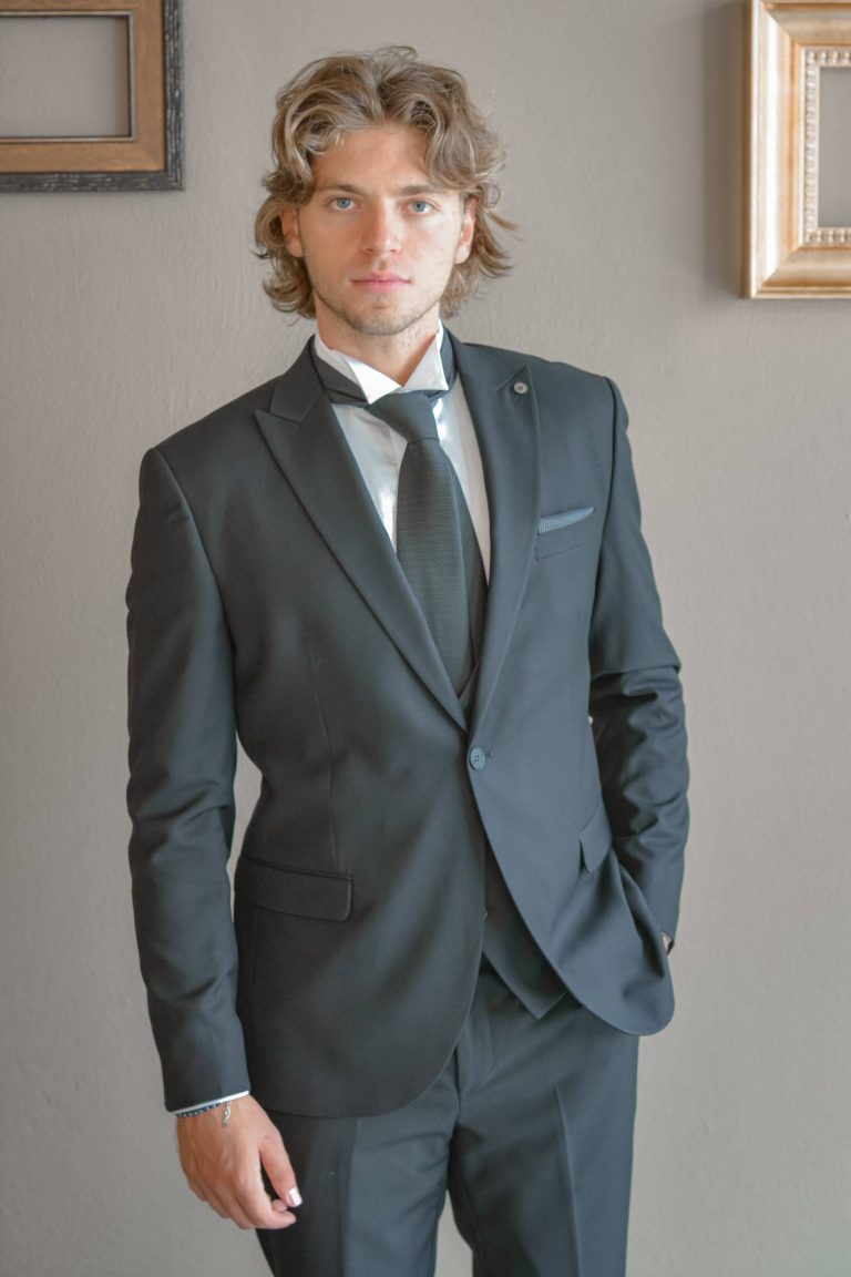 Abito da sposo classico in fresco lana con gilet profilato, disponibile anche con cravatta in coordinato.