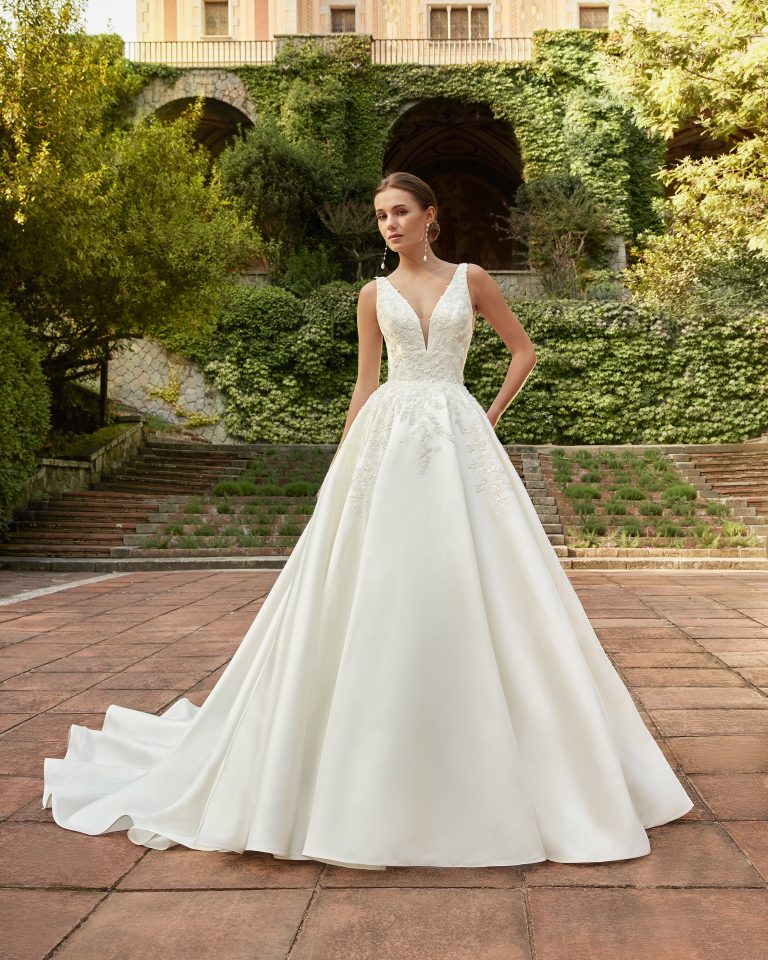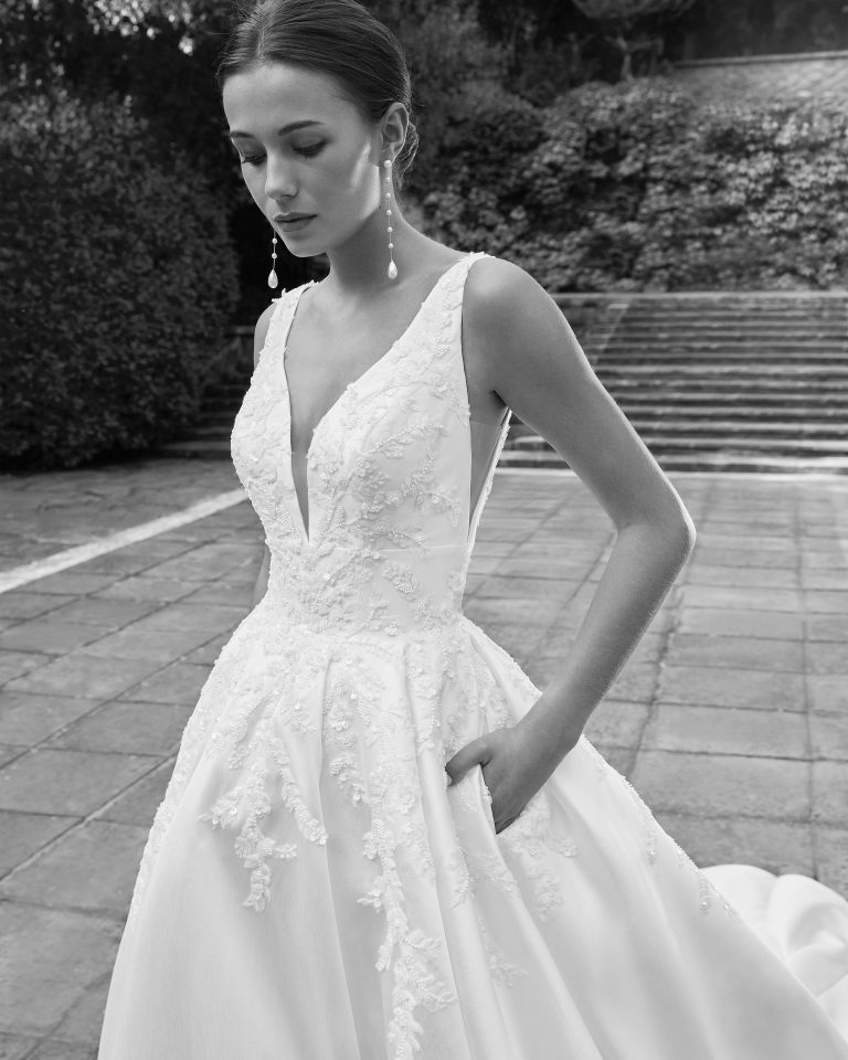 Elegante abito da sposa principesco realizzato in mikado e impreziosito da pizzo e strass. Pasion presenta uno scollo a V sul decolleté e sulla schiena e gonna con le tasche, questo modello esclusivo Luna Studio ti renderà la regina del tuo Grande Giorno.