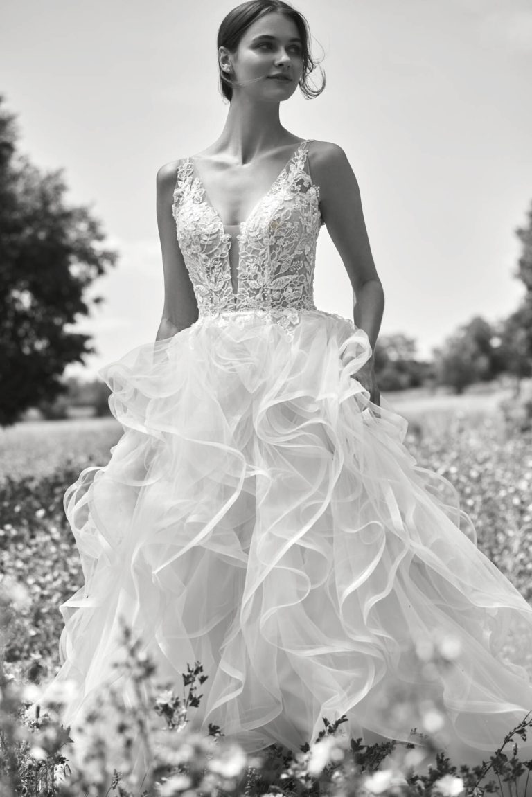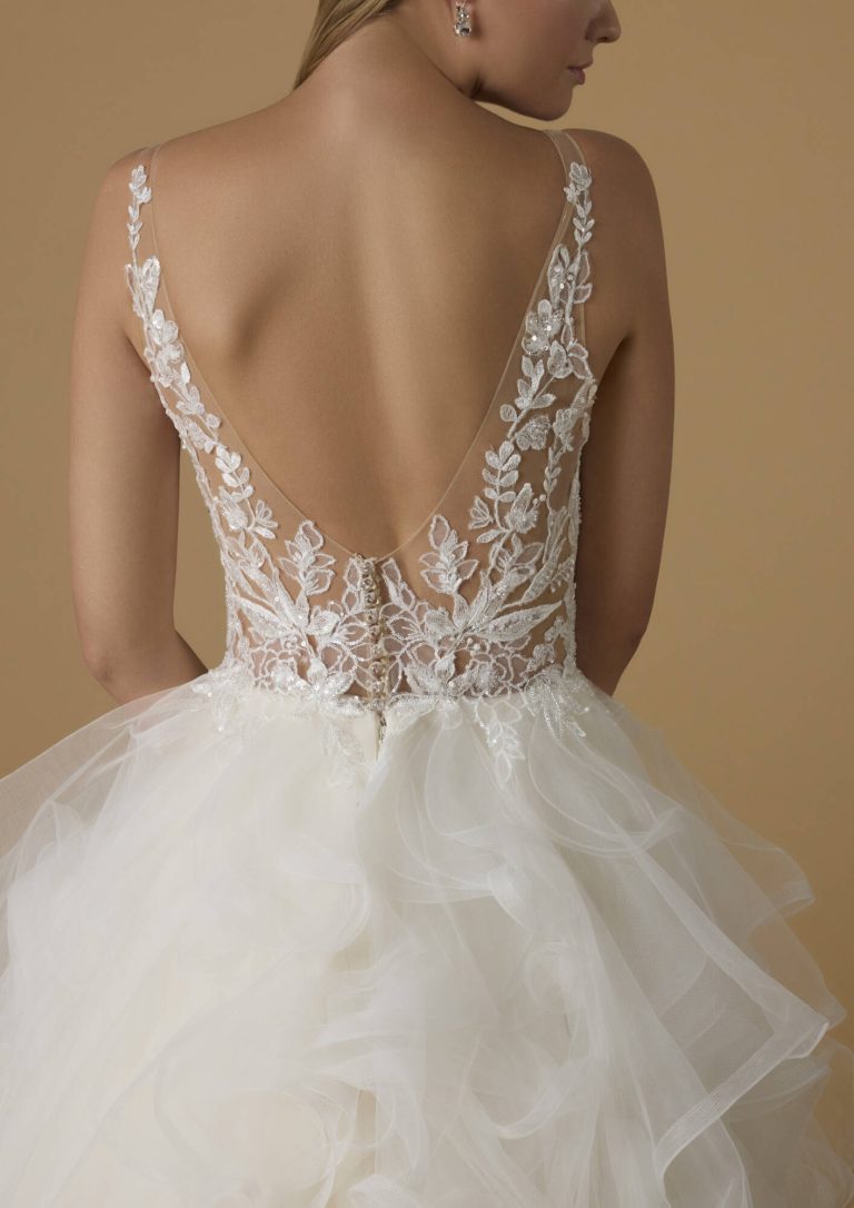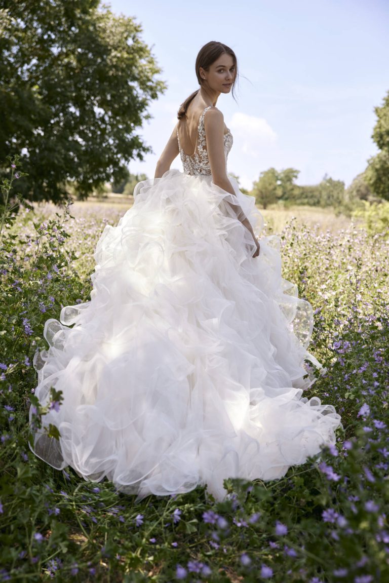 Innamorati di questo abito da sposa in tulle dal taglio principesco. Il corpetto è caratterizzato da trasparenze e fiori ricamati e da una pronunciata scollatura a V che viene riprodotta sulla schiena. La gonna del modello Patra è la grande protagonista, con la sua cascata di volant che termina con uno strascico a cattedrale.