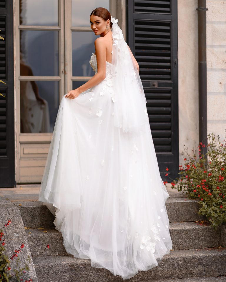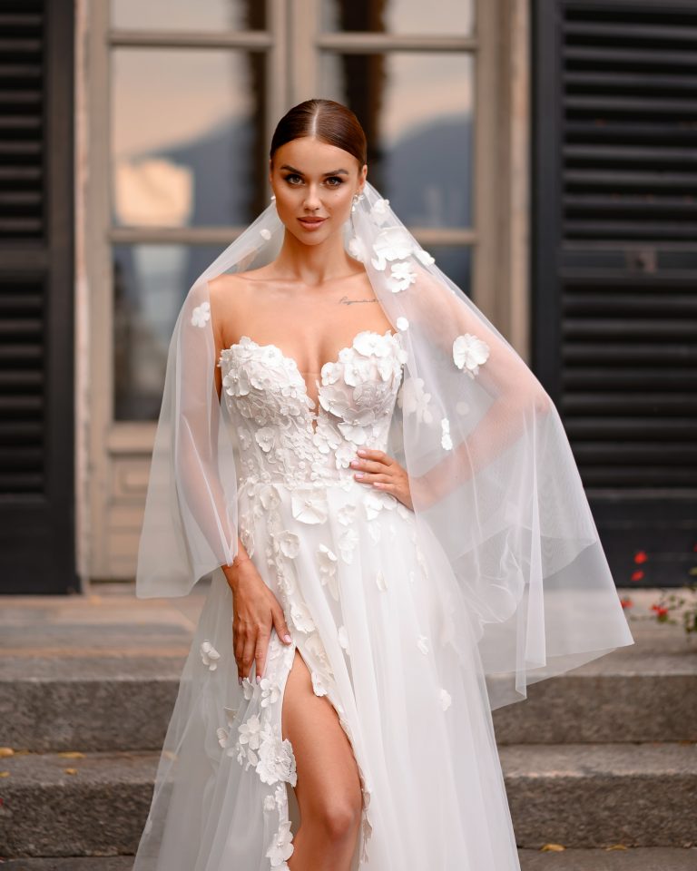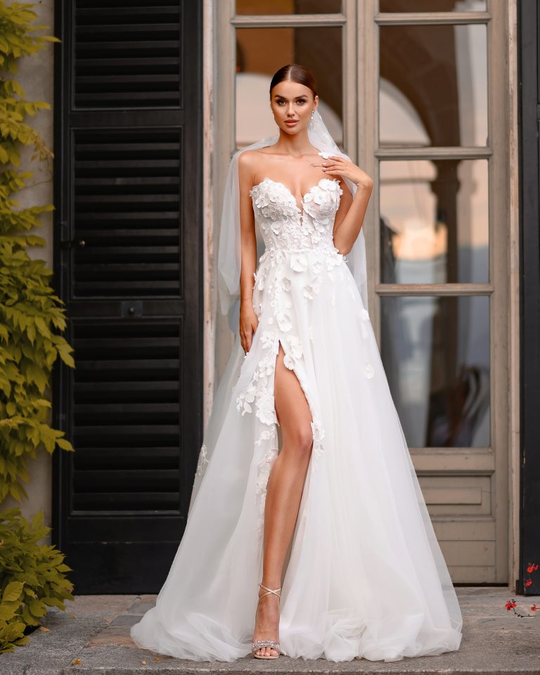 Romantico abito da sposa senza spalline dalla silhouette classica. L’abito è riccamente decorato con applicazioni floreali fatte a mano e ricami di perle. La scollatura a cuore è dolce e romantica. Una gonna con delicato spacco alto sulla gamba completa il look e aggiunge leggerezza e ariosità.