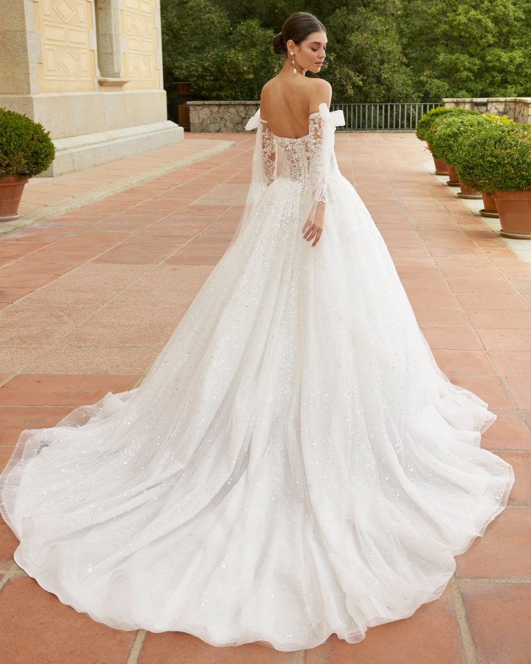 Romantico abito da sposa principesco confezionato in pizzo e strass, caratterizzato da scollo a cuore, schiena chiusa con abbottonatura e spalline staccabili, maniche staccabili anch’esse in pizzo e strass. Sfoggia questo outfit da sogno di Luna Studio.