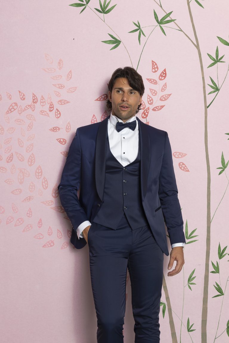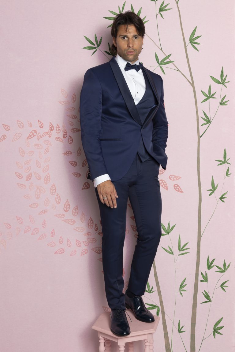 Luca Onestini è il testimonial ufficiale di King Of Rome, l’esclusiva linea di abiti da sposo di alta moda; qui indossa Petronio, uno smoking blu con revers sciallato in jacquard abbinato al gilet.