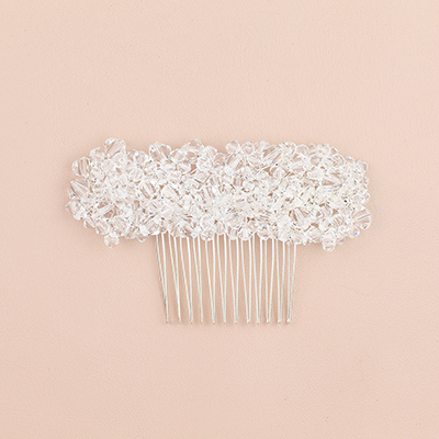 Raffinato pettinino da sposa interamente ricamato con cristalli trasparenti, ideale per acconciature luminose ed essenziali.