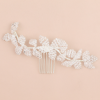 Delicato pettinino da sposa decorato con eleganti foglie in filo intrecciato. Ideale per acconciature romantiche e classiche.