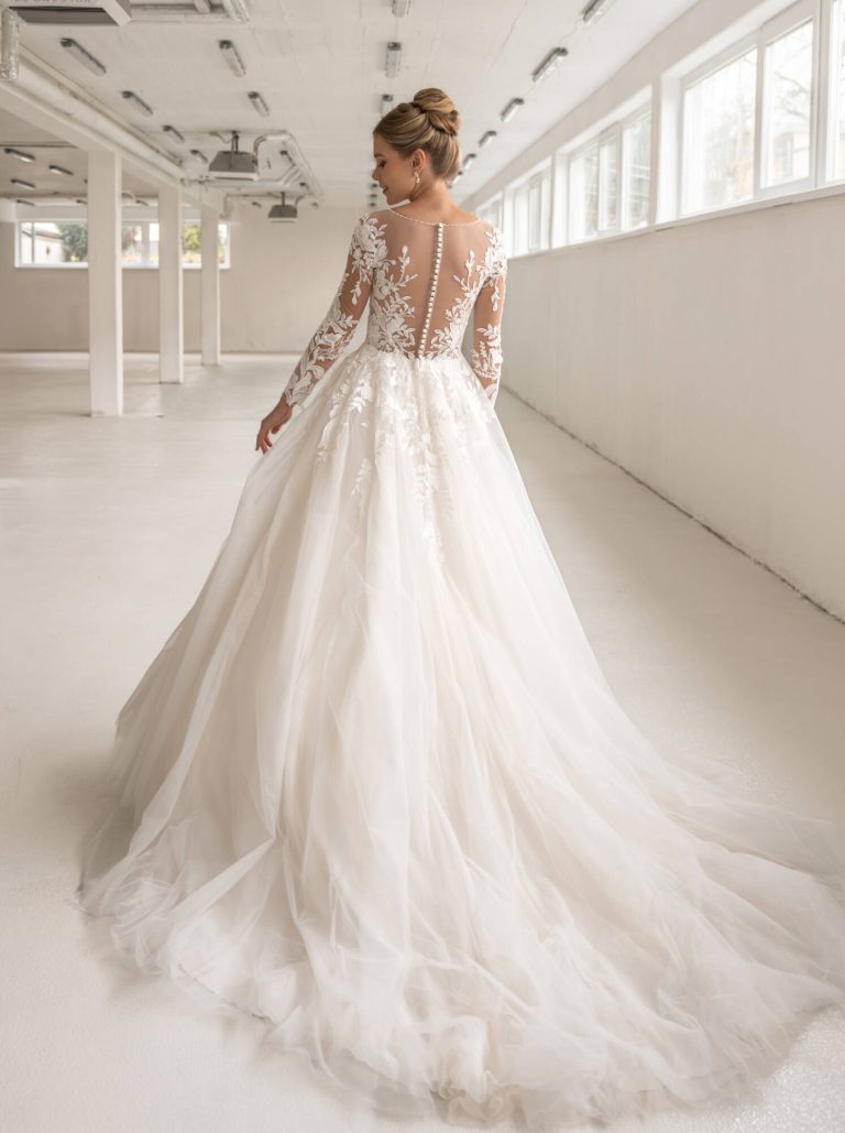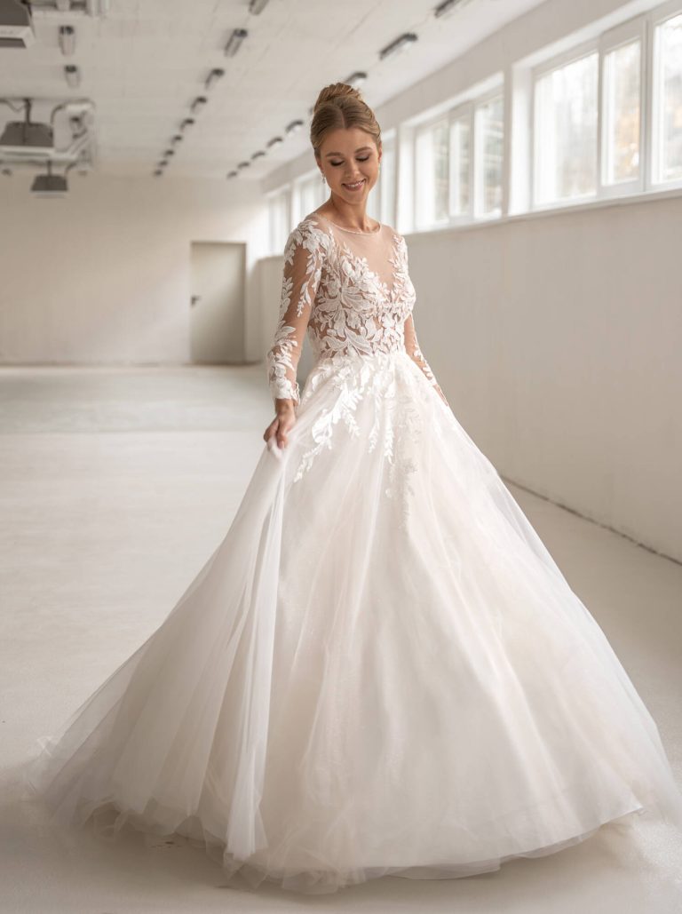 Linee romantiche e dettagli raffinati per questo vestito da sposa in tulle impreziosito da ricami floreali su bustino e maniche. La gonna ampia e vaporosa dona movimento e incanto, perfetta per un sogno ad occhi aperti.