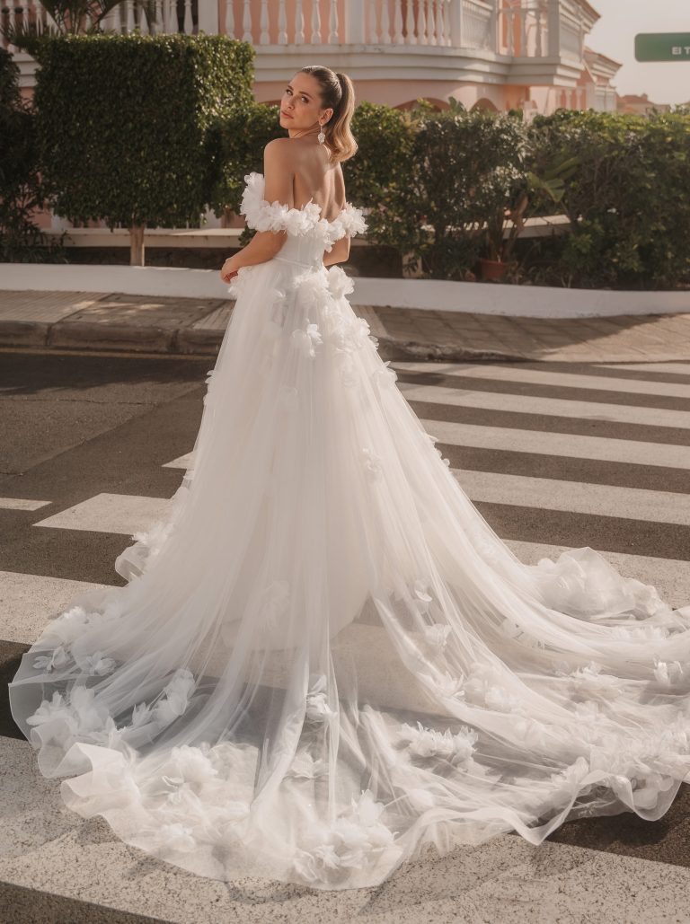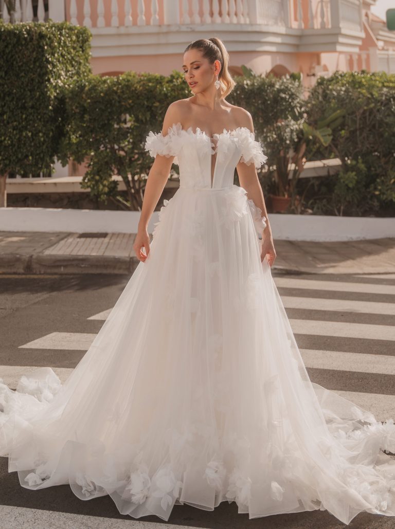 Abito da sposa principesco in tulle con applicazioni floreali tridimensionali. Il corpetto con profonda scollatura e maniche off-shoulder arricchite da petali vaporosi crea un effetto romantico e contemporaneo. Ideale per la sposa che sogna un look fiabesco ma di tendenza.
