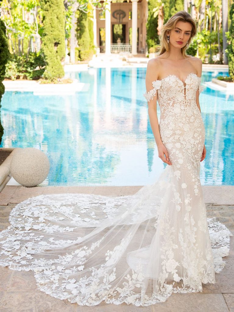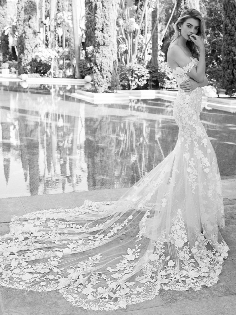 Delicati pizzi floreali ricamati e ricche applicazioni su una rete sparsa di paillettes, conferiscono una dimensione straordinaria a questa silhouette a sirena che risalta la figura.