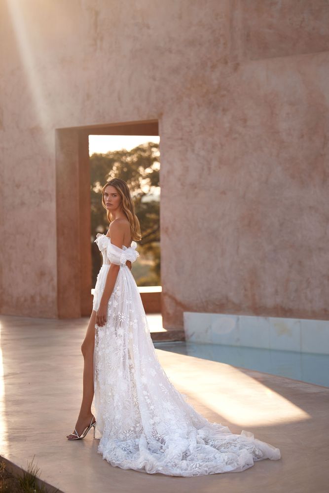 Il modello Russel è caratterizzato da un corpetto con scollo a cuore, spalline in tulle impreziosite da fiori 3D che lasciano le spalle scoperte e una maxi gonna.