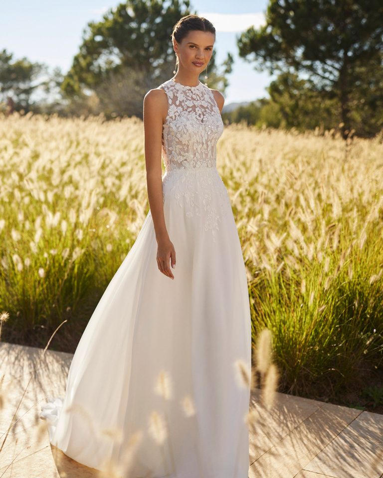 Abito da sposa realizzato in georgette con corpetto in pizzo, perline, scollo all’americana e schiena scoperta.