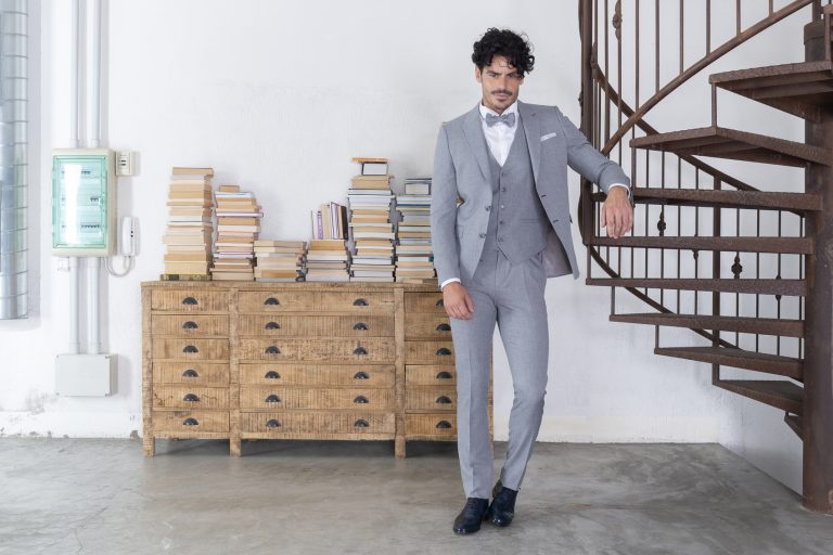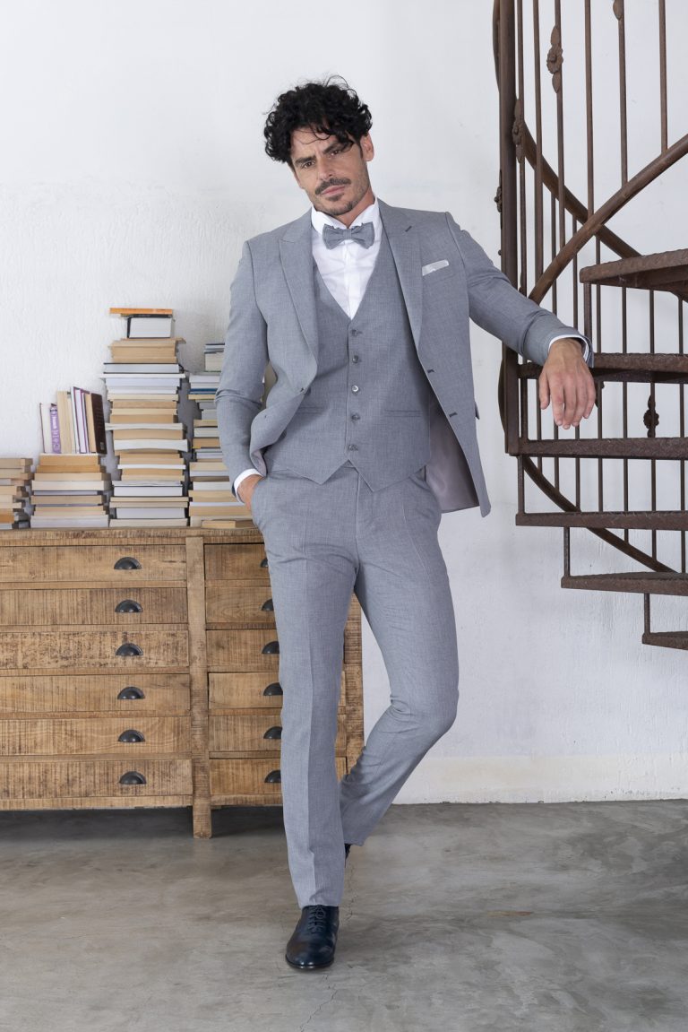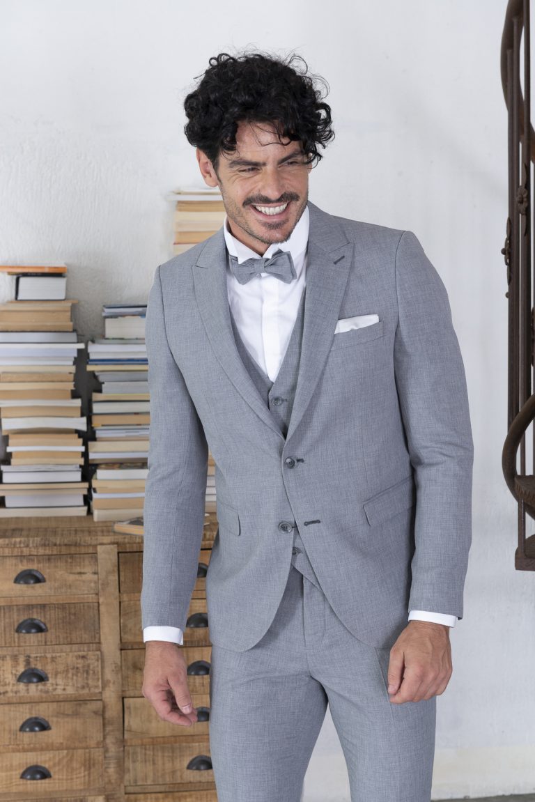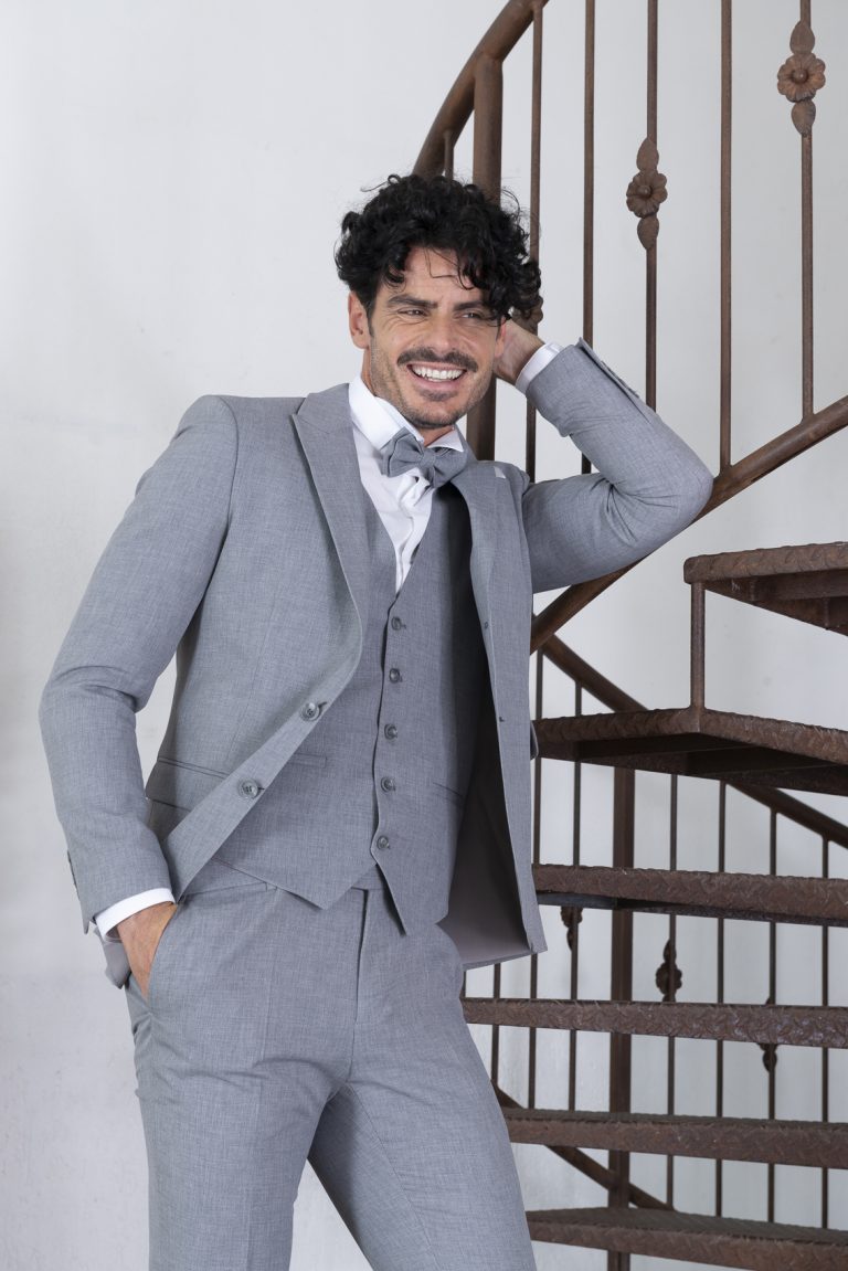 In foto indossa un abito da sposo classico in color grigio medio, giacca a due bottoni e gilet monopetto.