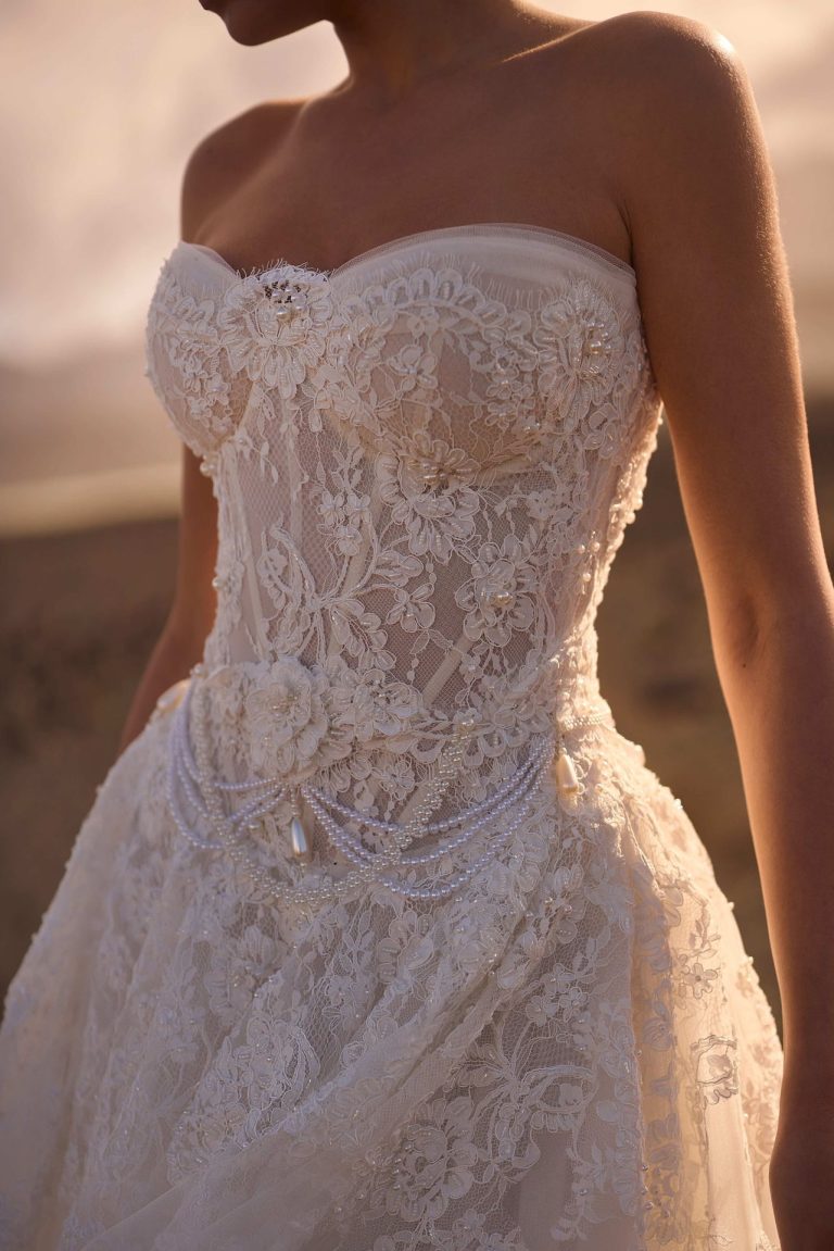 Splendido abito da sposa a trapezio realizzato in delicato pizzo chantilly. Presenta una scollatura a cuore, un corsetto trasparente con stecche, decorato con una delicata fila di bottoni, coppe integrate, cerniera posteriore e una voluminosa gonna a principessa con un lungo strascico. Il look può essere impreziosito da un bolero trasparente a collo alto e maniche lunghe Selvianne o da un choker in pizzo Monica di ispirazione vintage.