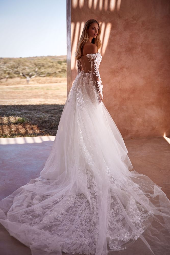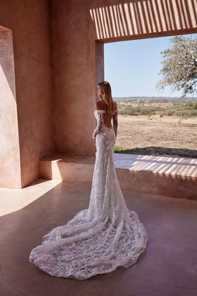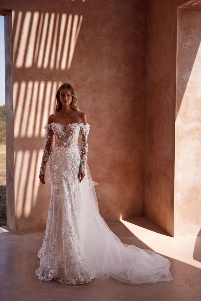 Abito da sposa a sirena a maniche lunghe e spalle scoperte, completamente ricoperto di applicazioni floreali volumetriche e paillettes.