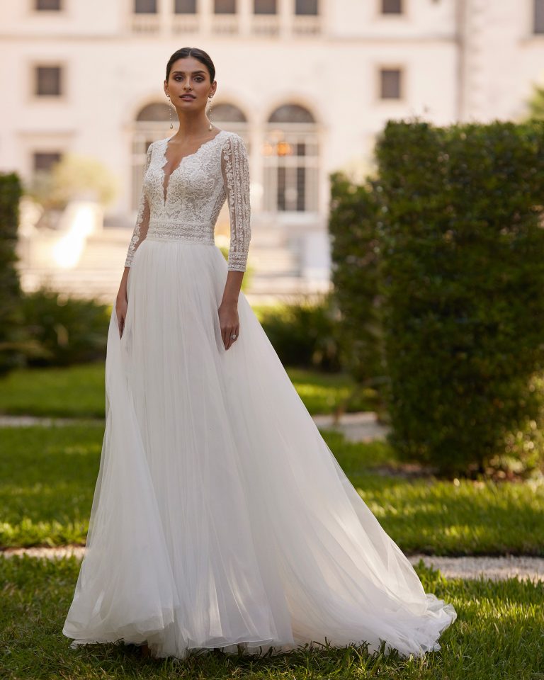 Romantico abito da sposa realizzato in tulle morbido, pizzo e strass. Goditi la magia di questo look unico di Aire Barcelona con scollo profondo, schiena effetto illusione e maniche lunghe