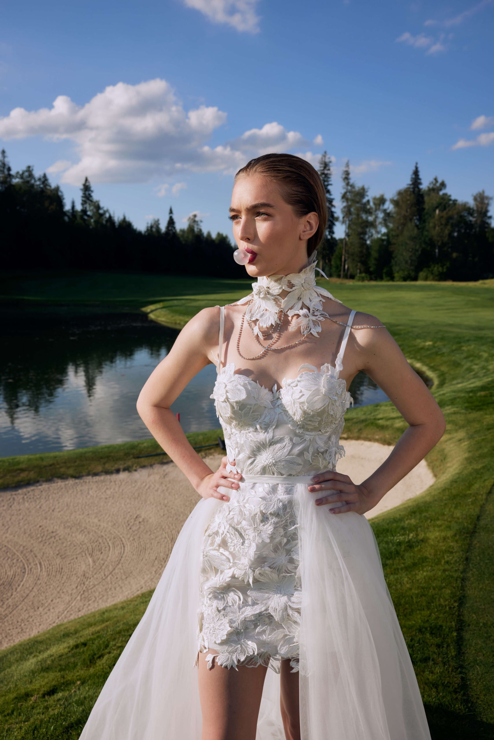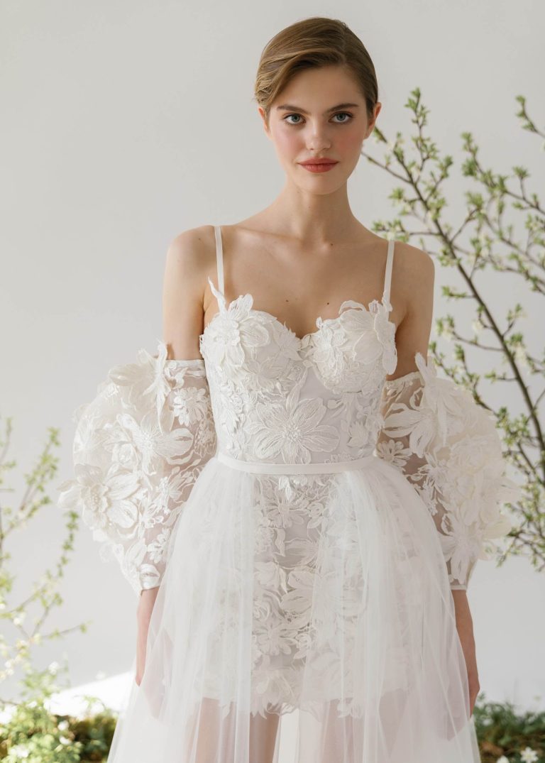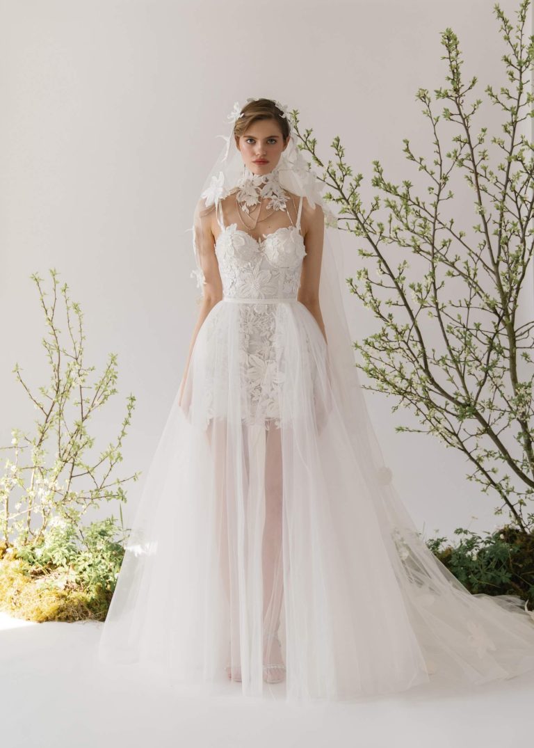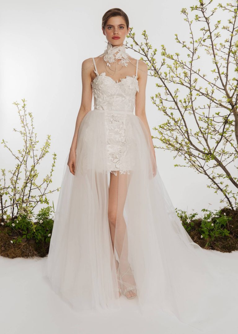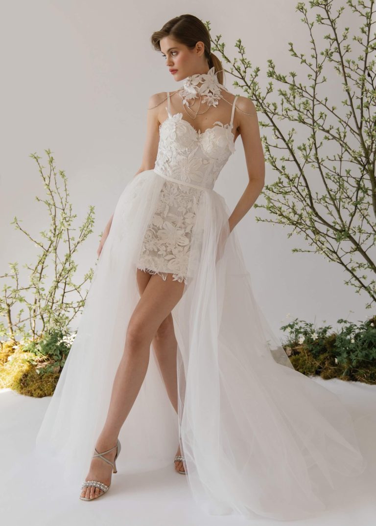 Mini wedding dress by Rara Avis. Solano è un abito da sposa romantico ma frizzante, realizzato in pregiato pizzo e morbido tulle. Sceglilo se desideri un look versatile, originale e tremendamente di tendenza!