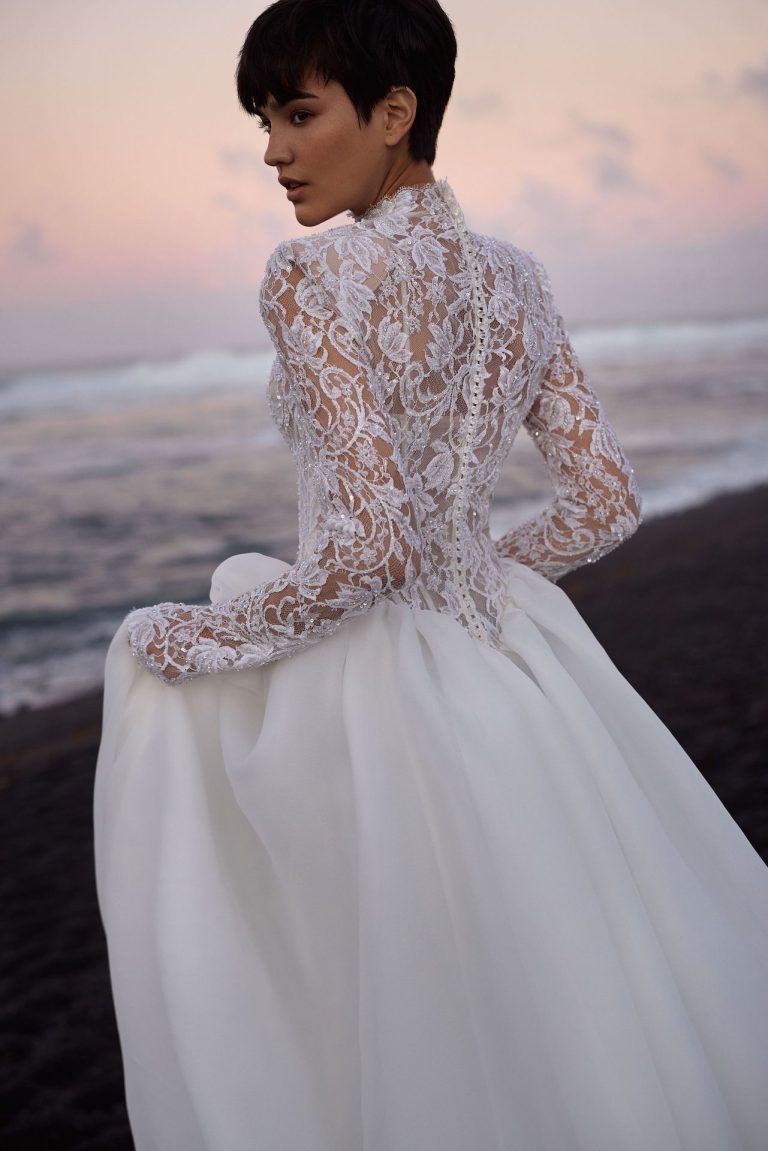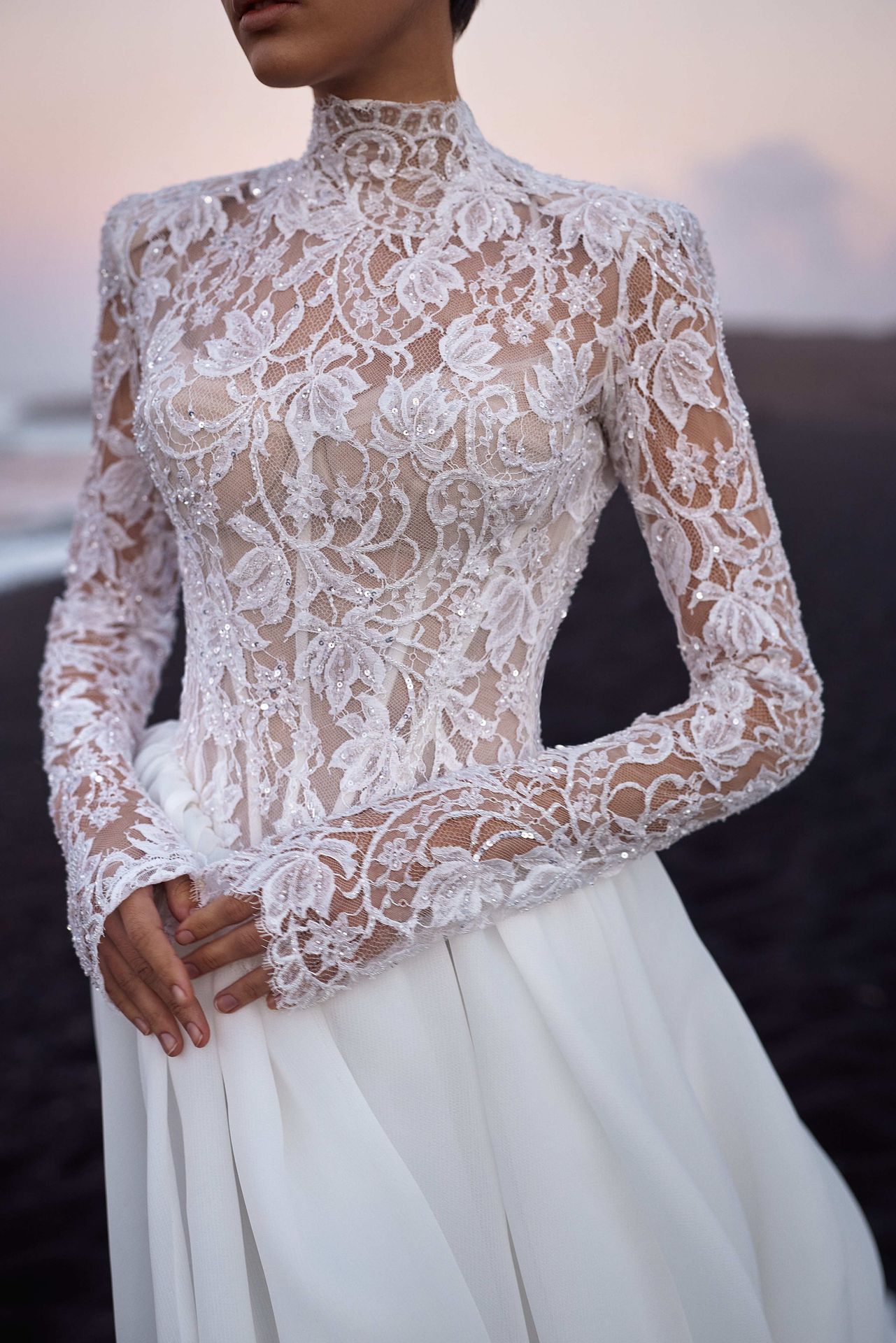Splendido abito da sposa a maniche lunghe con corsetto semitrasparente impreziosito da delicato pizzo floreale e decori luminosi. Soreya presenta scollatura alta, corsetto a vita bassa con stecche a vista, schiena chiusa con bottoni e una voluminosa gonna in organza che scende elegantemente dalla vita bassa fino a formare un maestoso strascico.