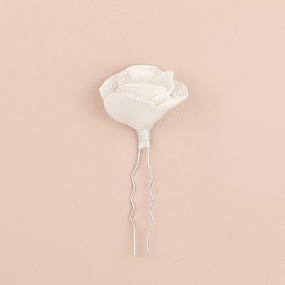 Delicato spillone da sposa con rosa in tessuto avorio e dettagli perlati, ideale per completare l’acconciatura con un tocco floreale romantico.