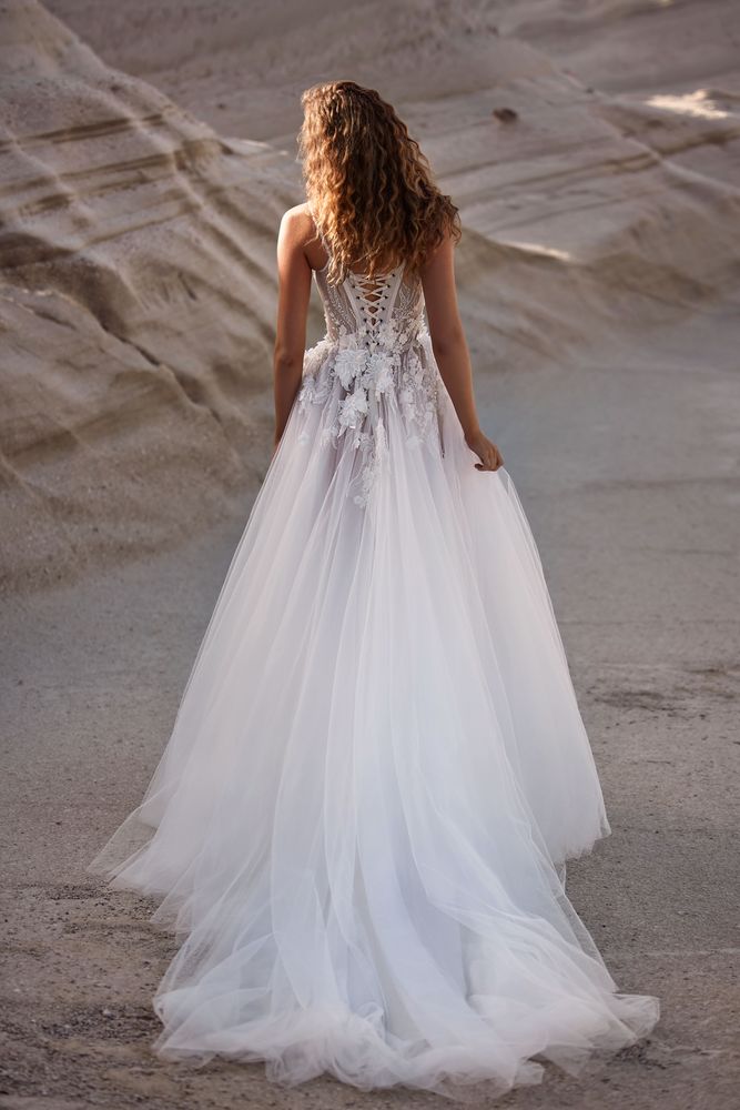Caratterizzato da corpetto a forma di cuore con chiusura con lacci sul retro, gonna a sbuffo in tulle con audace spacco laterale e lungo strascico.