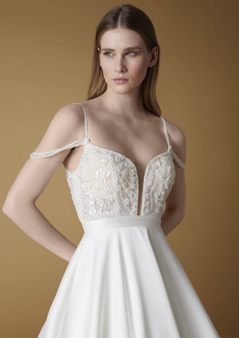 Linee pulite ed eleganti per questo abito da sposa dal taglio principesco con scollatura a cuore. Il corpetto è caratterizzato da sottili spalline gioiello, che cadono in una doppia linea sotto le spalle come ornamento. La schiena presenta una scollatura a V che esalta ulteriormente il volume della gonna, grazie al tessuto mikado in cui è realizzata.