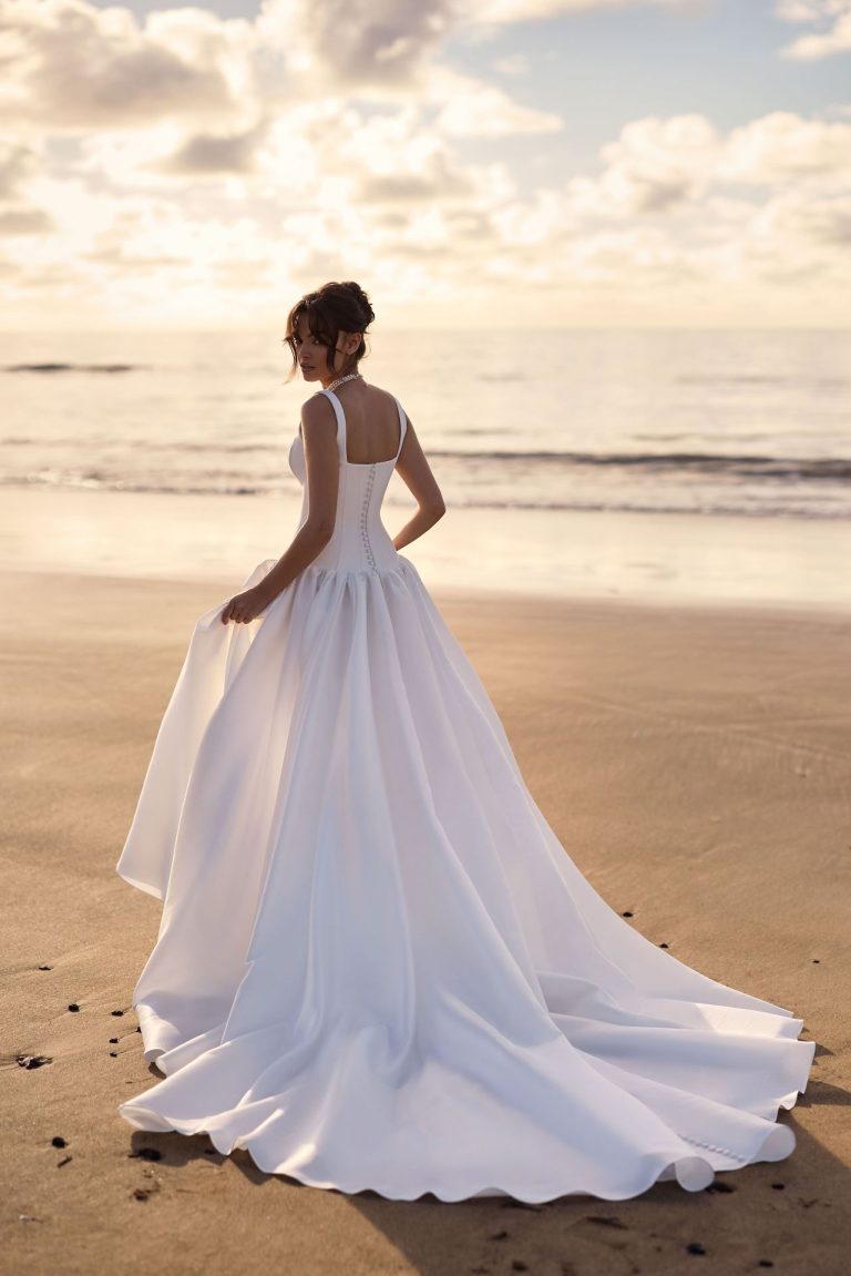 Abito da sposa minimalista a trapezio con vita bassa, realizzato in raso. Tousaint presenta una scollatura quadrata incorniciata da ampie spalline e un corpetto aderente. L’ampia gonna è splendidamente arricciata, fluendo dalla vita bassa fino a una lunghezza maxi con uno splendido lungo strascico. L’abito Tousaint è dotato di un accessorio di perle staccabile che accentua il punto vita e dona un tocco di romanticismo al look. Può essere completato con un velo Tousaint.