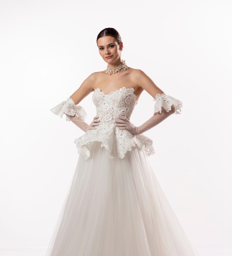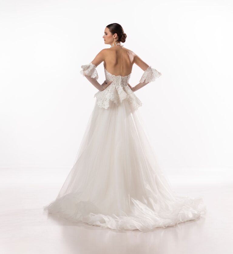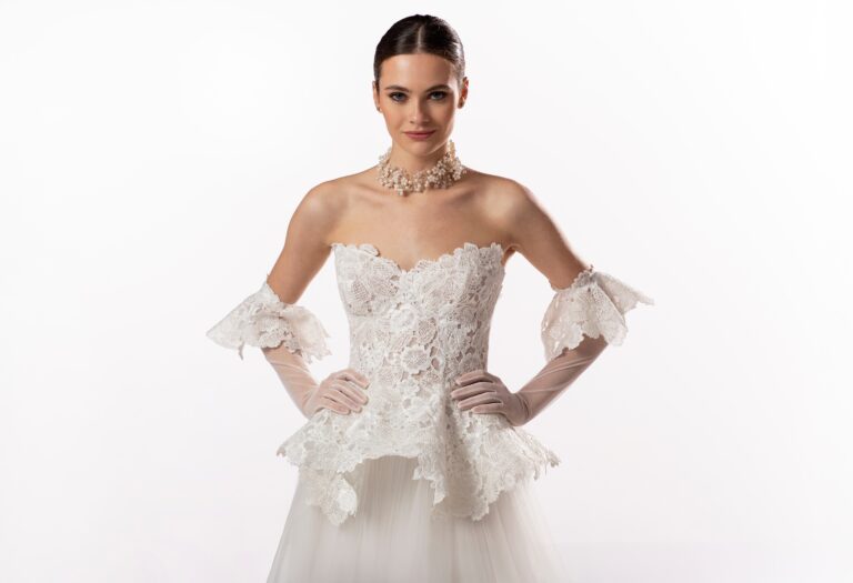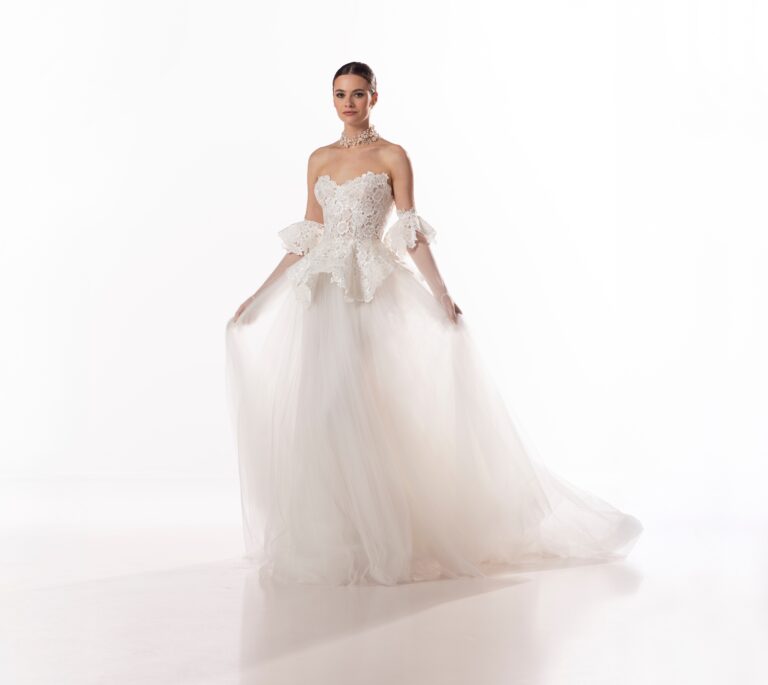 Un abito da sposa scenografico e sofisticato, pensato per la sposa che desidera vivere il suo giorno con l’eleganza esclusiva dell’alta moda.