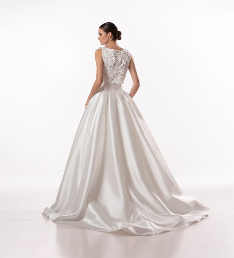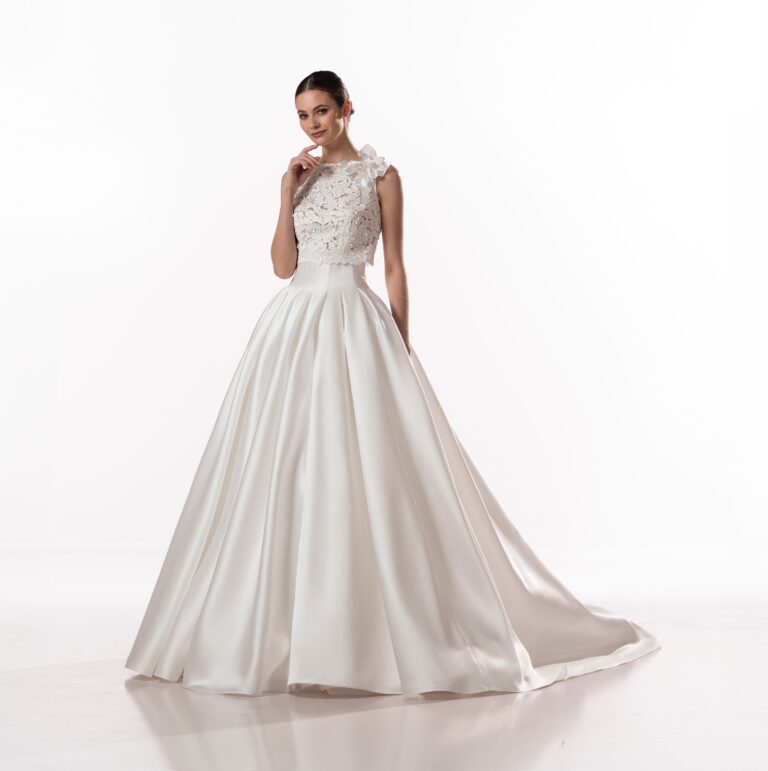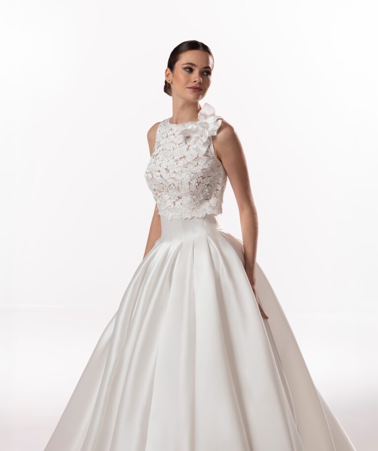 Abito dalla linea principesca con corpino ricamato in pizzo floreale 3D e gonna in mikado, ampia e strutturata da profonde pieghe. Un modello romantico ma con un’eleganza pulita e senza tempo.