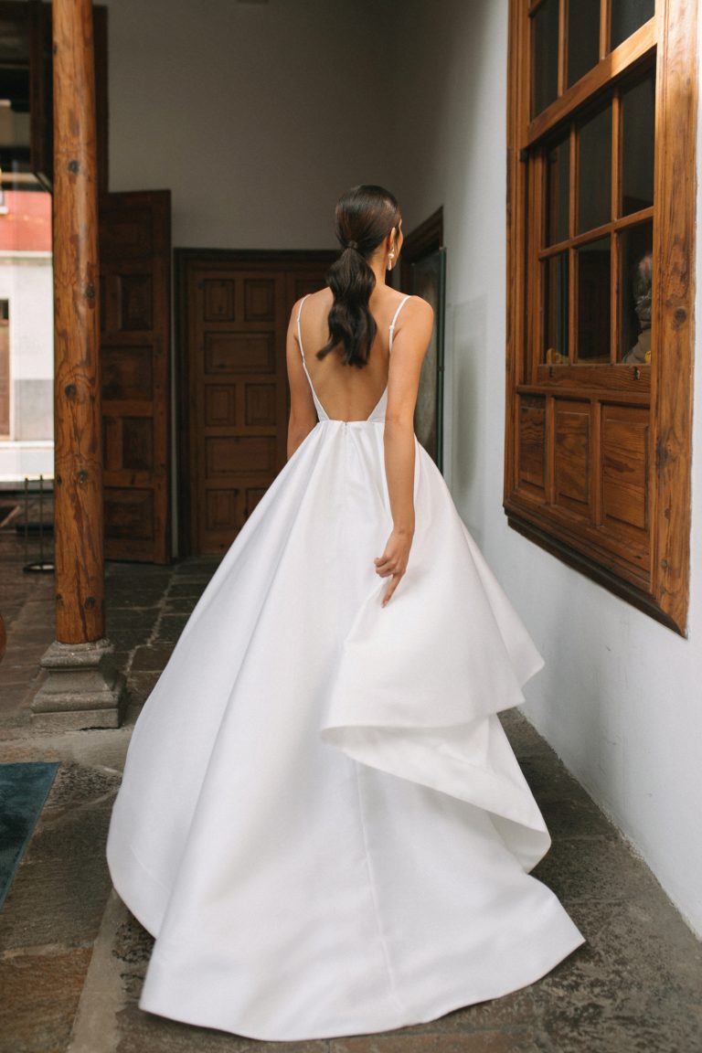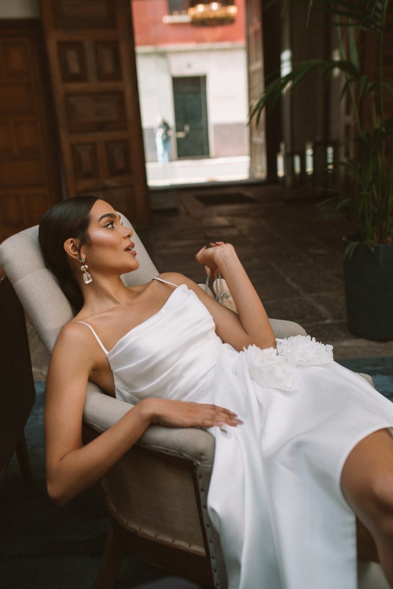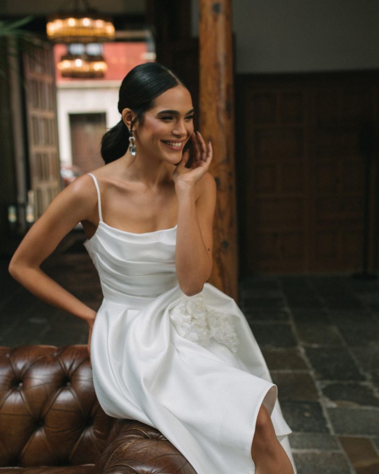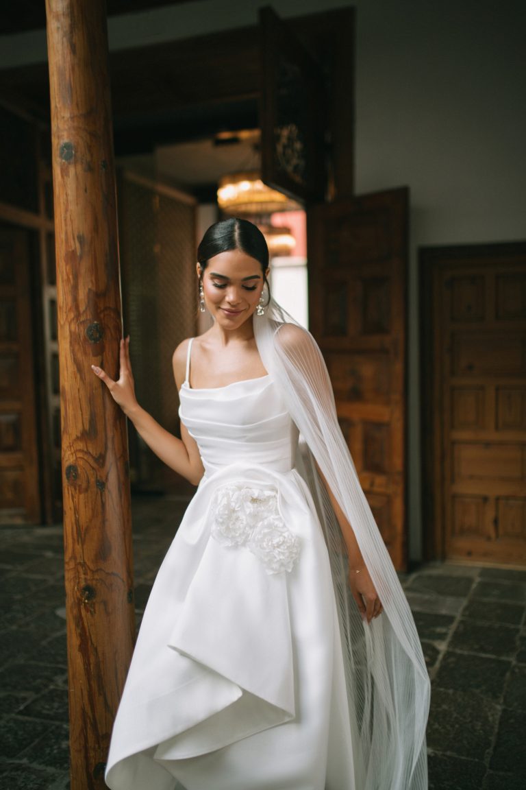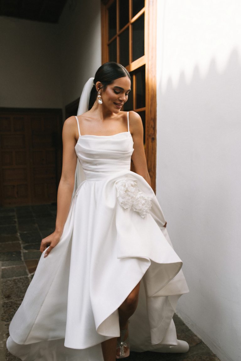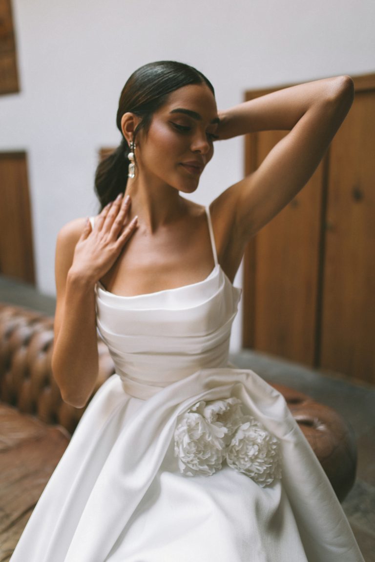 Abito da sposa dalla silhouette ad A. L’accento principale è il drappeggio sul lato sinistro della gonna, che è decorato con tre grandi fiori tridimensionali.