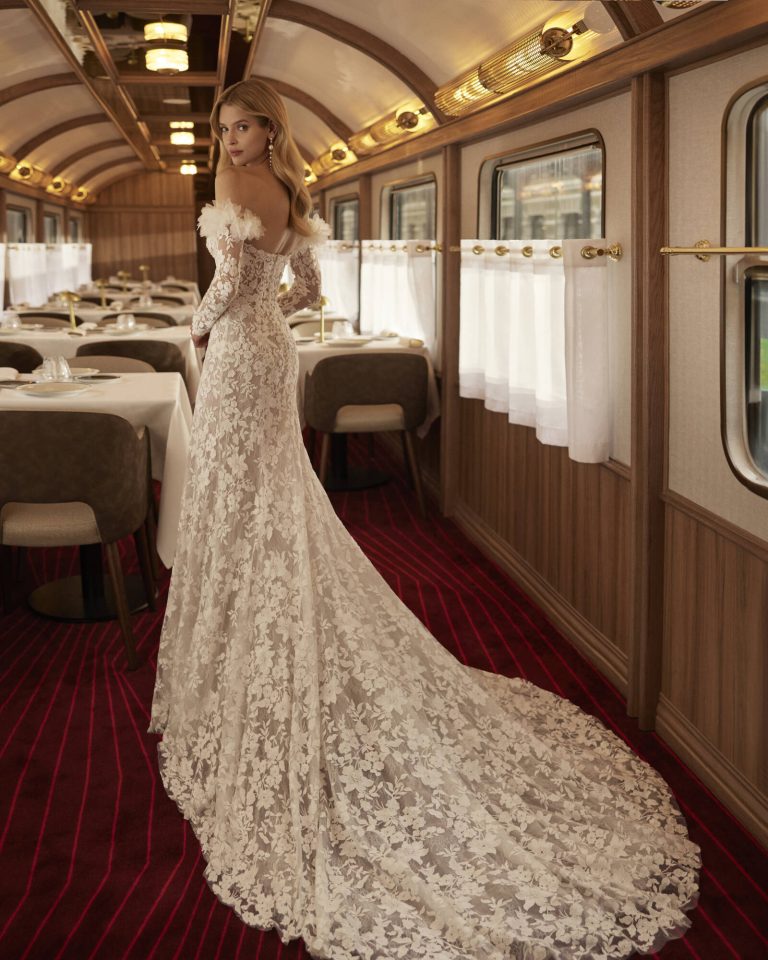 Romantico abito da sposa sirena lungo confezionato in pizzo con applicazioni di strass. Corpetto con scollo senza spalline e maniche rimovibili. Un modello Aire Barcelona esclusivo.