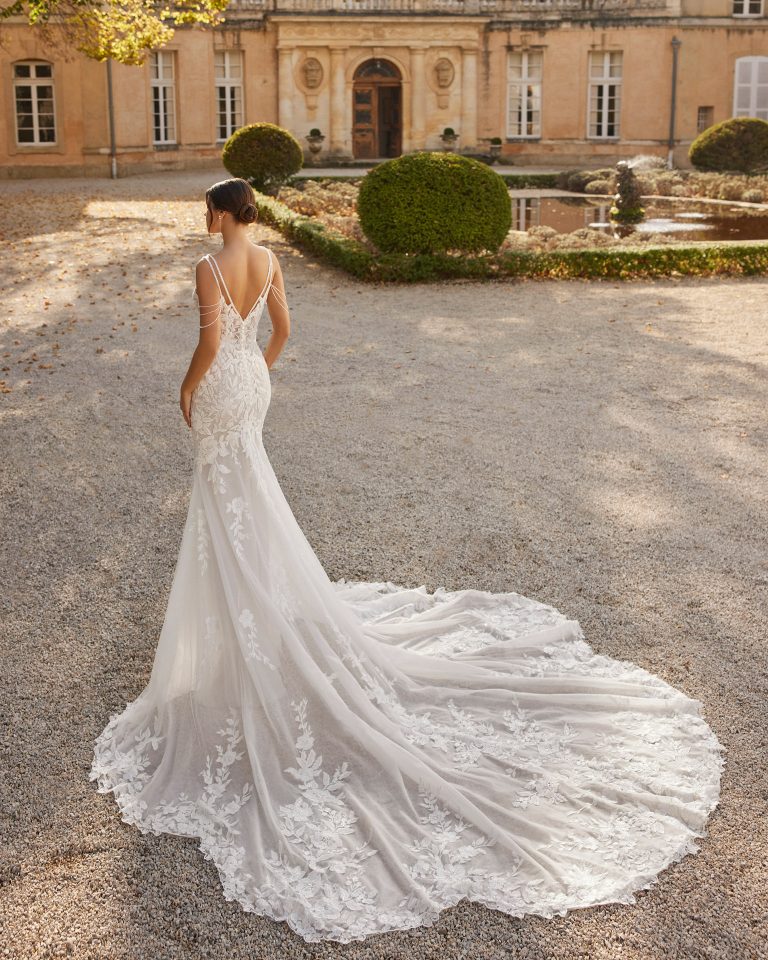 Abito da sposa a sirena realizzato in pizzo ricamato e caratterizzato da un ampio strascico regale.