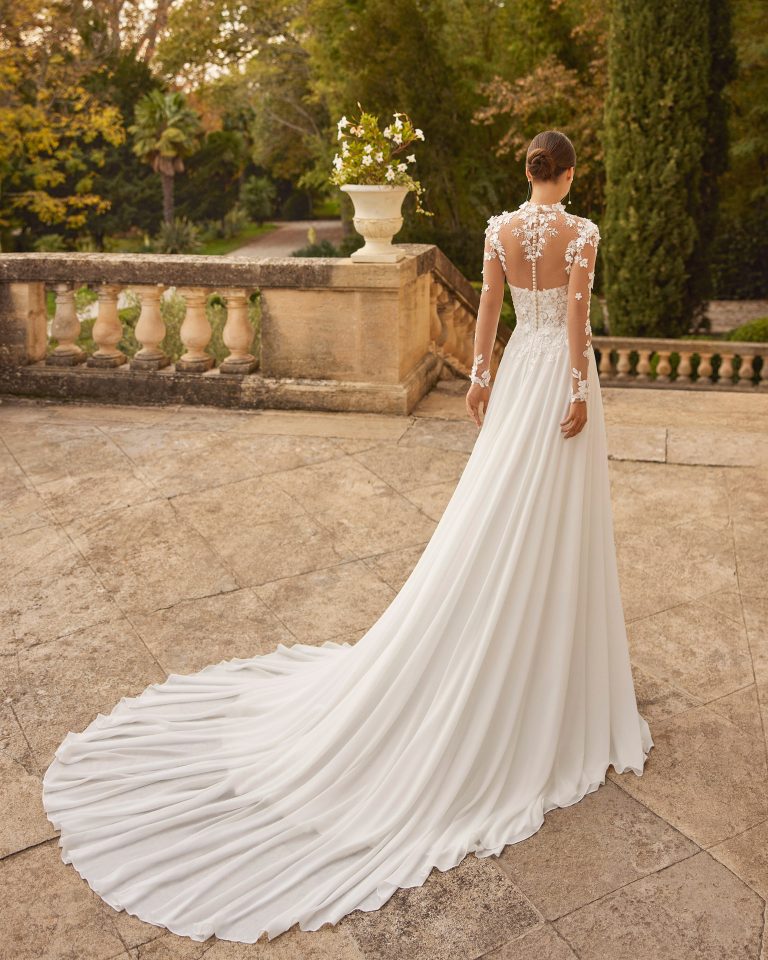 Abito da sposa realizzato in georgette con pizzo e perline, corpetto a decolleté, schiena scoperta e delicato spacco laterale nella gonna. Tocco glamour il giacchino in pizzo.