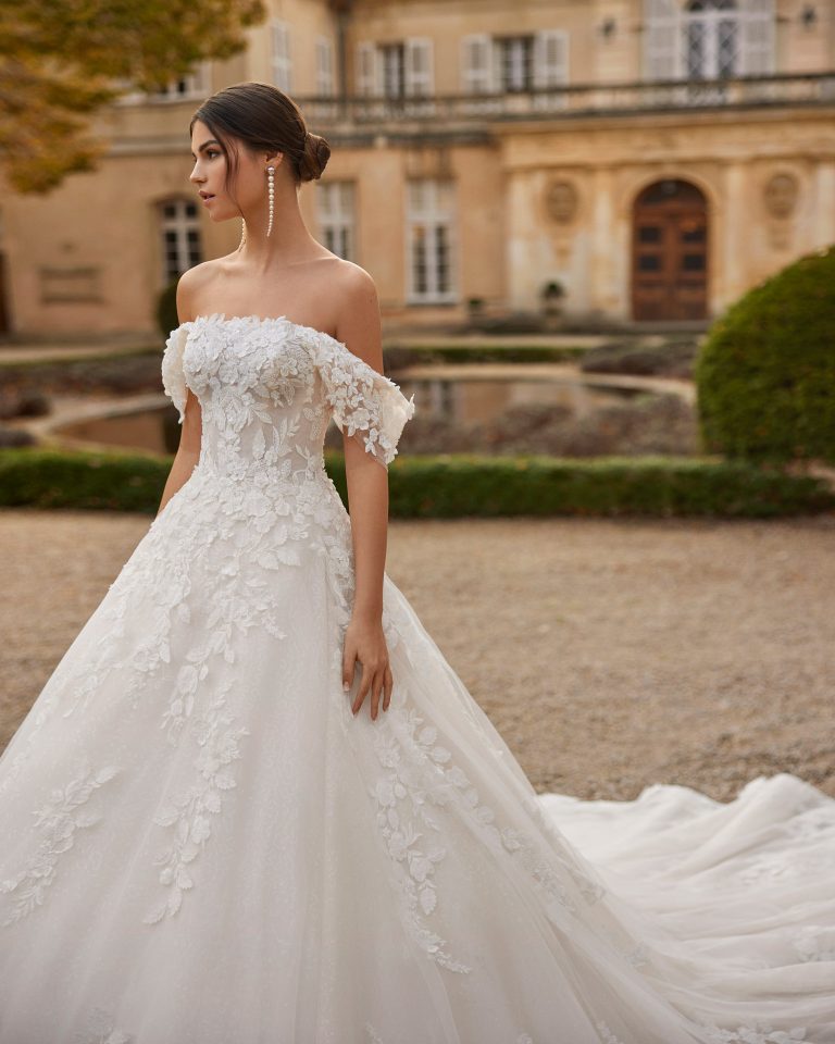 Abito da sposa da vera principessa, con pizzo e perline, scollo a cuore, spalline cadenti e schiena a corsetto.