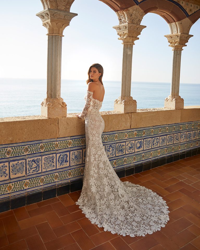 Abito da sposa avvolgente a sirena firmato Aire Barcelona, realizzato in raffinato pizzo ricamato color avorio. Il corpetto a cuore con maniche lunghe off-shoulder esalta la femminilità con eleganza, mentre la lavorazione floreale dona un fascino sensuale e sofisticato. Ideale per una sposa decisa, romantica e contemporanea.