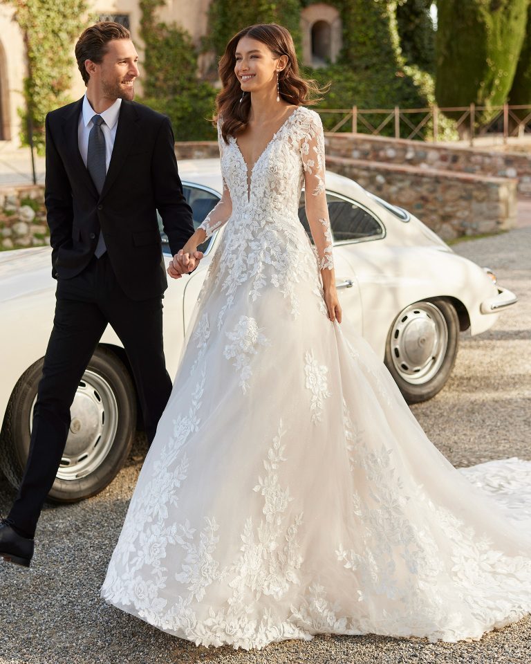 Abito da sposa ideato per una vera principessa, luminosissimo strato di glitter sull’ampia gonna in tulle; scollo a V sul davanti e sulla schiena e maniche lunghe in pizzo. Outfit Aire Royale esclusivo confezionato in tulle e pizzo impreziosito da strass.