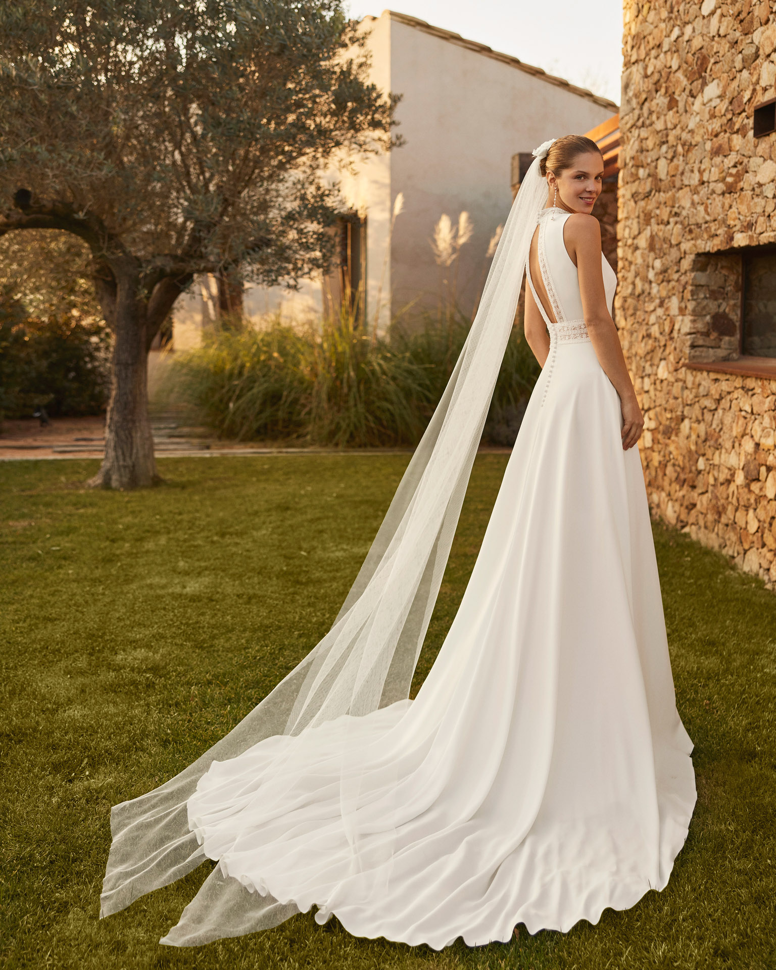 Abito da sposa svasato in crepe, con scollo all’americana, schiena scoperta e gonna con spacco. Lo scollo all’americana, una delle tendenze più moderne per le spose, dona un tocco di eleganza minimalista e contemporanea. La silhouette svasata e la gonna con spacco offrono movimento, mentre la schiena scoperta aggiunge una nota di raffinatezza audace. Un vestito da sposa dalla linea boho chic.