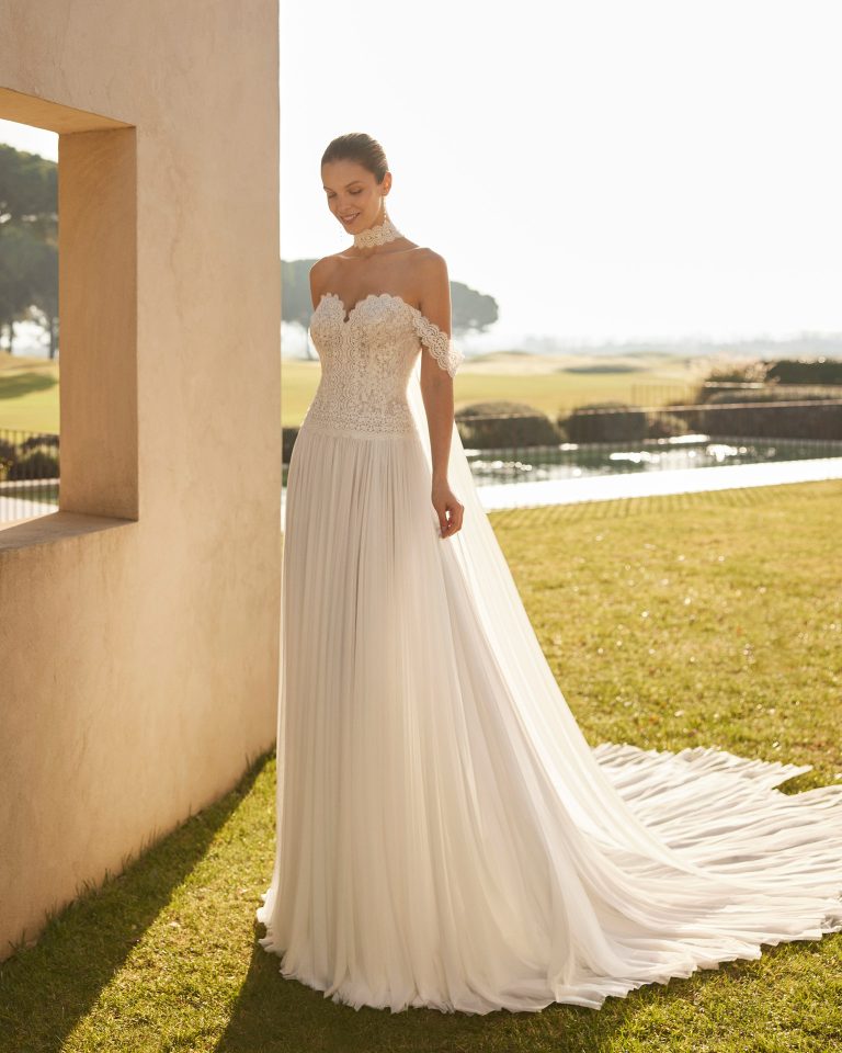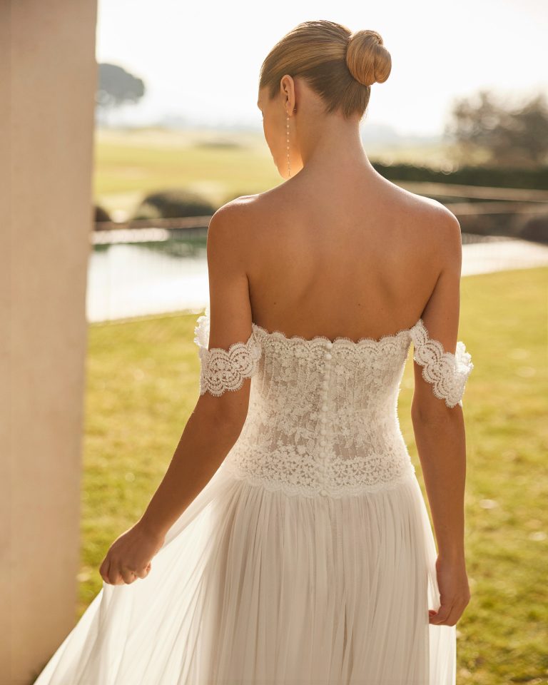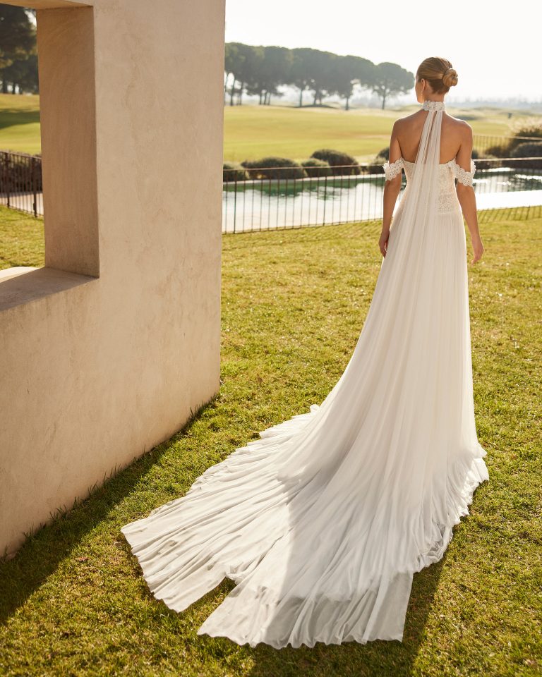 Abito da sposa boho chic realizzato in mussola, con corpino in pizzo con perline, scollo a cuore e spalline cadenti. La schiena scollata è esaltata da un elegante choker con drappeggi, che aggiunge un tocco di fascino e originalità. Il design combina la delicatezza della mussola con la raffinatezza del pizzo, creando un look romantico e sofisticato, perfetto per la sposa che ama uno stile bohémien e contemporaneo