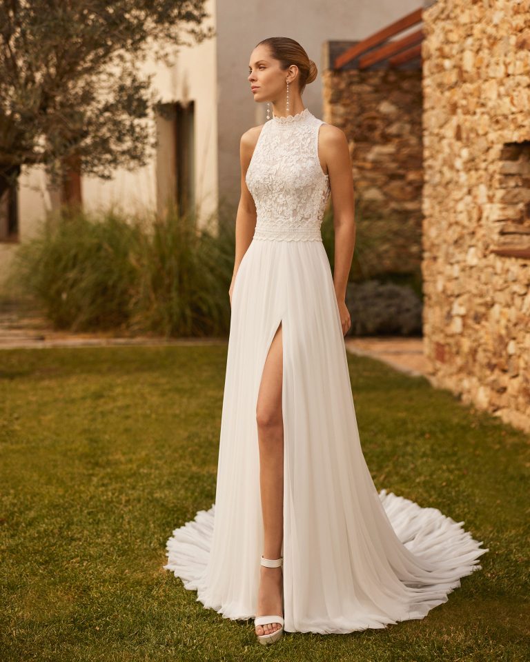 Abito da sposa scivolato dal taglio dritto in mussolina, con corpino in pizzo e perline e collo halter, un dettaglio che rappresenta una delle tendenze più in voga nella moda bridal. La schiena aperta e lo spacco nella gonna aggiungono un tocco sensuale e raffinato.